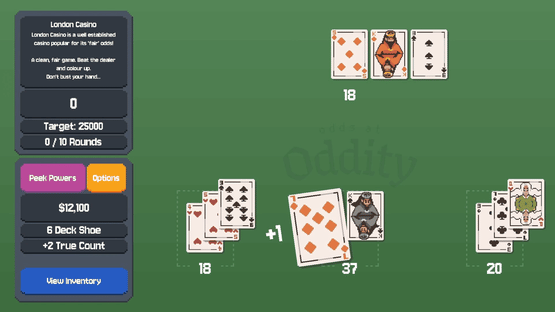 Odds At Oddity is a blackjack based roguelike deck builder. Manage your power betting deck, create diverse combinations and scale your points as far as you can go!