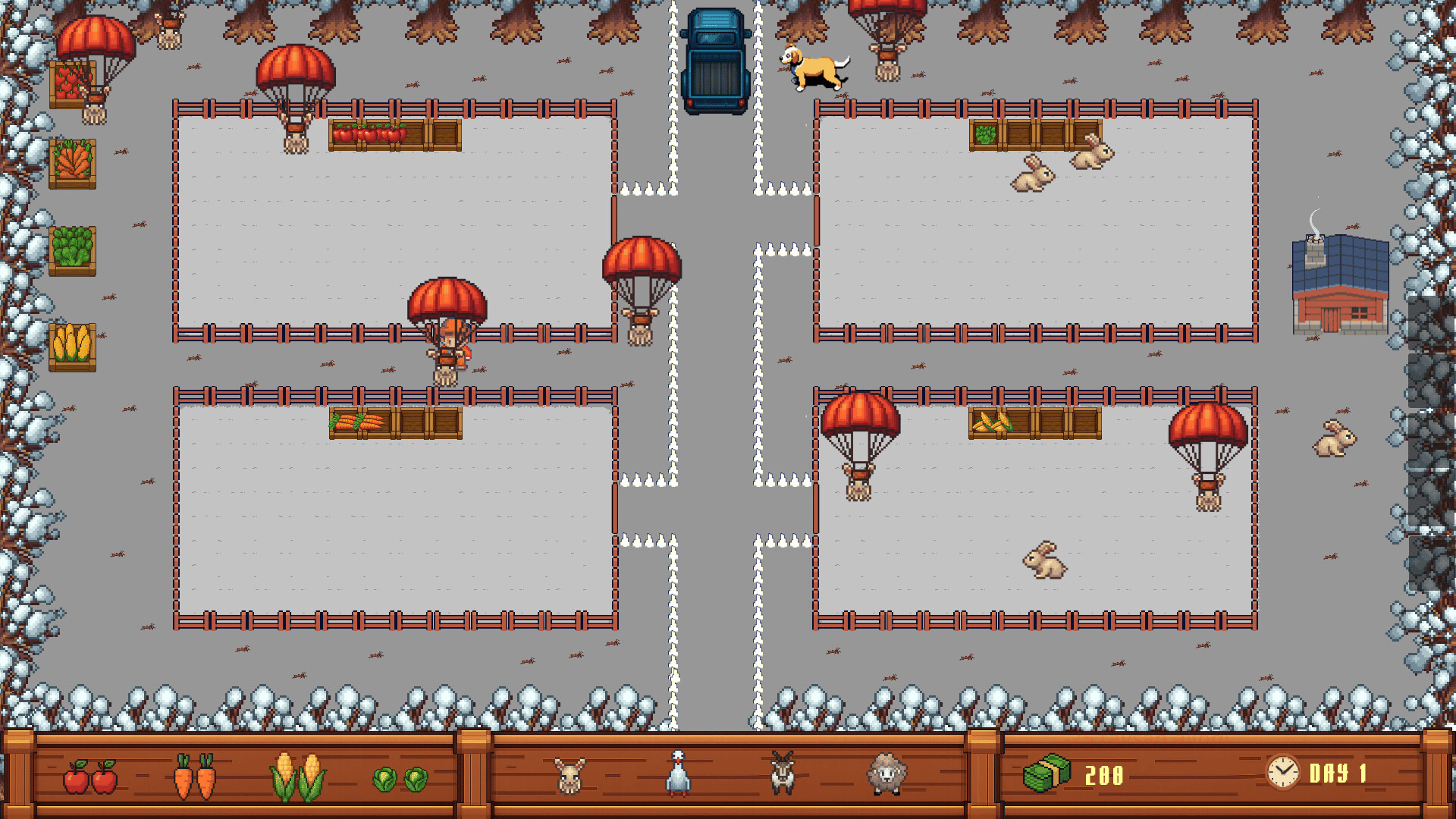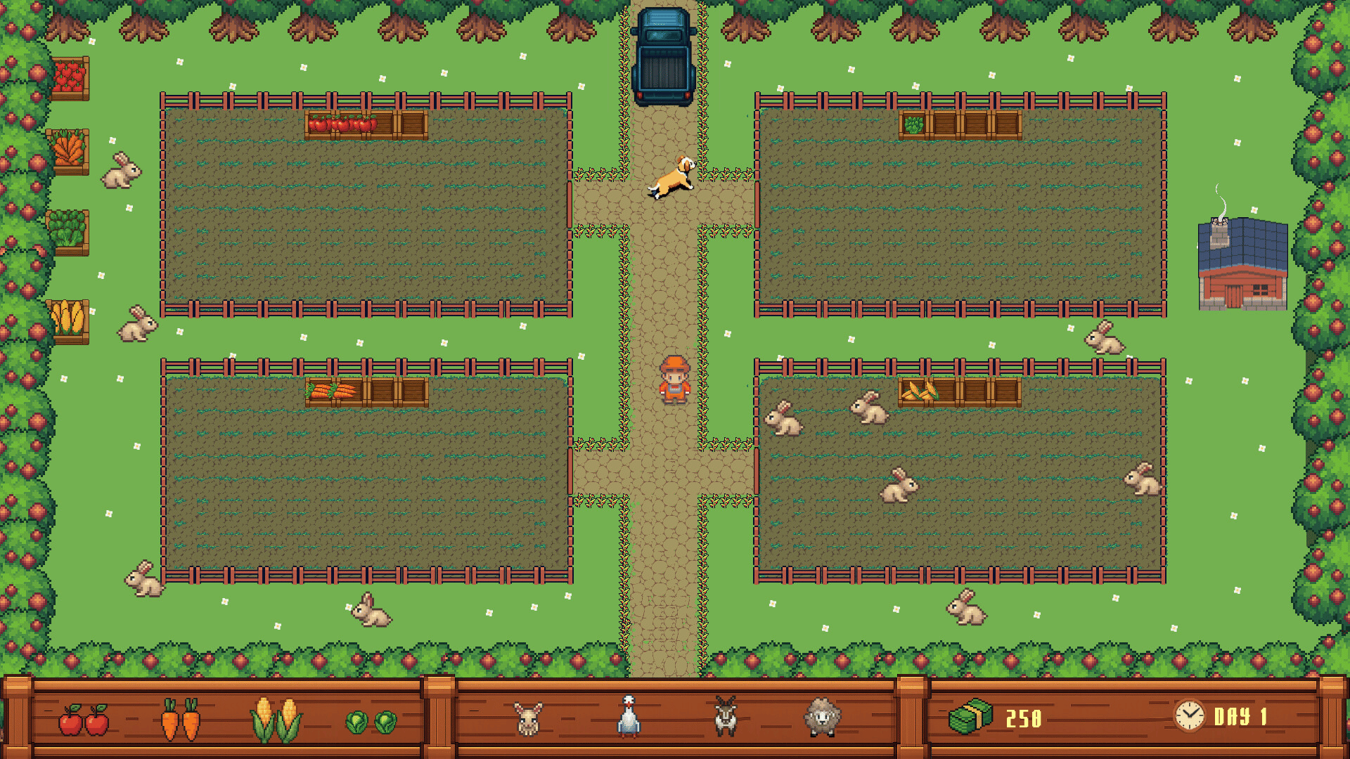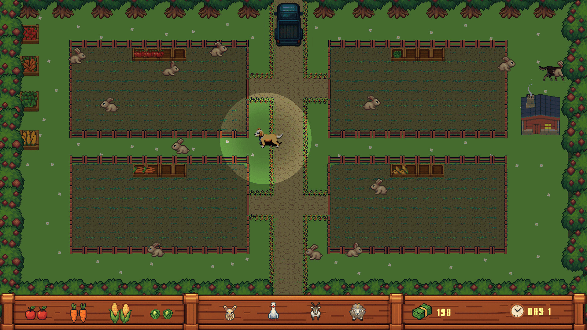 A cozy animal farm game with seasonal cycles, day and night routines, gentle wolf encounters, and relaxing animal care. Raise rabbits, geese, goats, and sheep, produce and sell goods, and let loyal dogs protect your farm after dark.