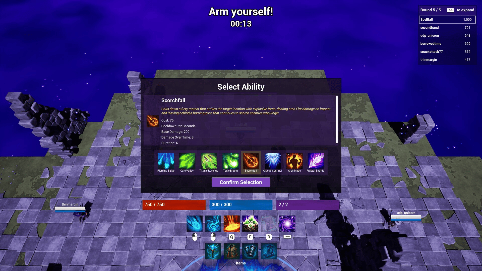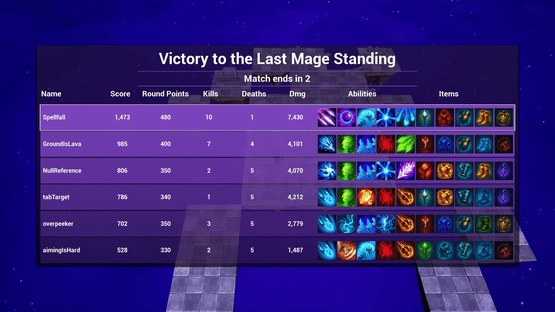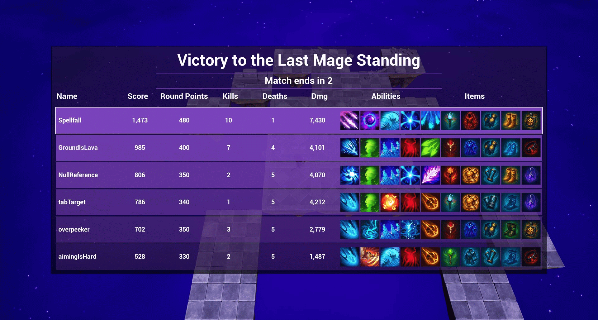 Spellfall: Last Mage Standing is a fast paced top-down arena brawler where 6 mages draft spells and items across 5 rounds, battle on a collapsing magic infused arena, and fight to be the last mage standing.