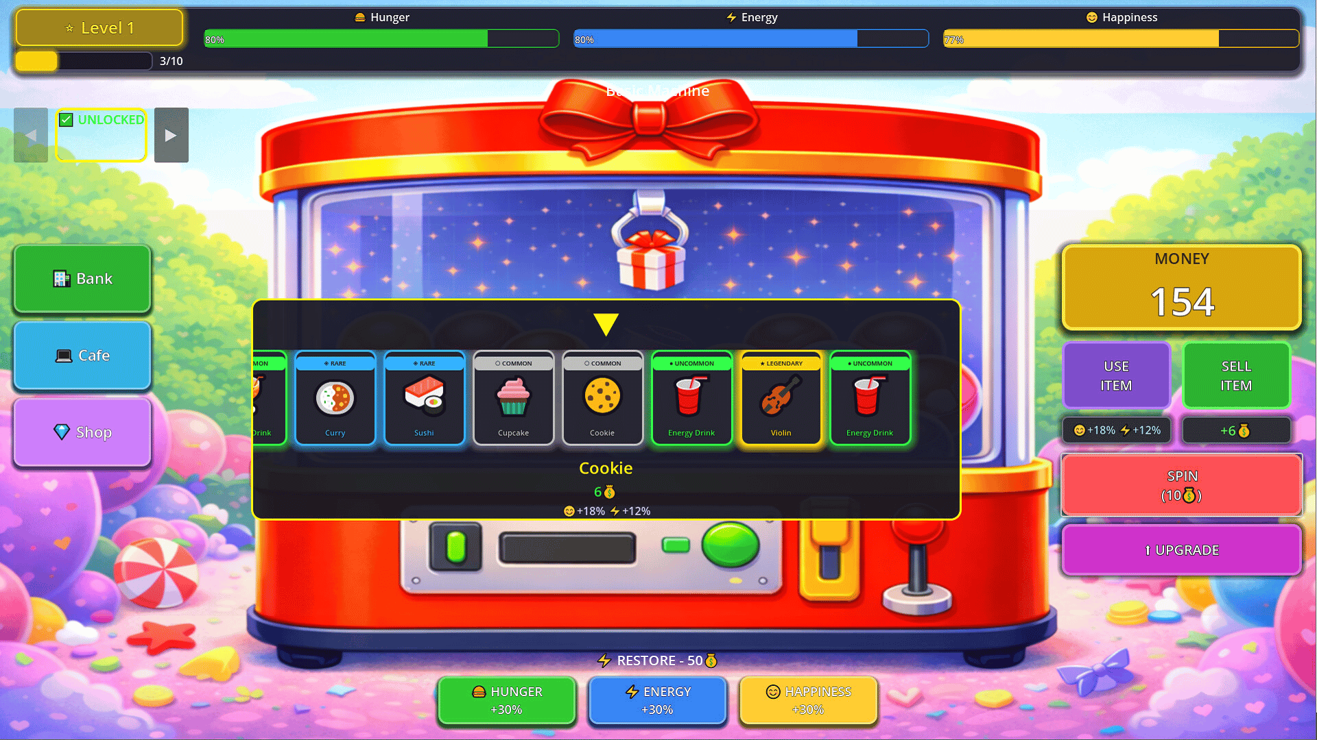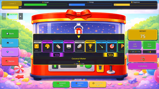 Survive with surprise gifts dropping from the machine! Sell or use them. Maintain the balance between hunger and energy, manage your bank, grow with your credit card, and buy homes and cars. Every choice changes your fate. Survive the roguelike challenge by combining luck and strategy.