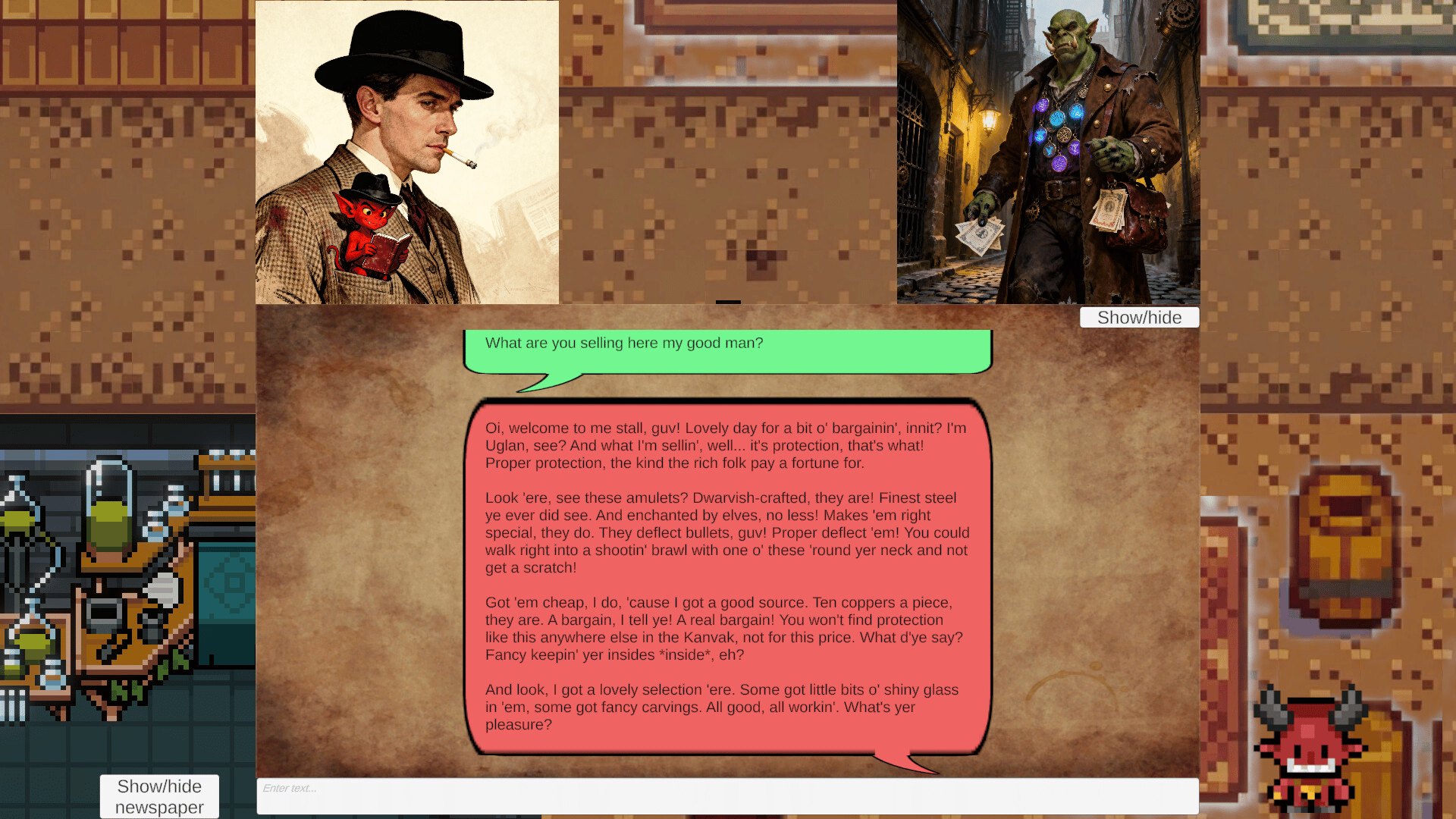 A cozy AI driven game where you play a journalist in a steampunk fantasy city. Change is coming to Raversul, and with the help of your imp and your newspaper you will play a powerful role in shaping it. Solve mysteries, uncover stories, and shape politics in this revolutionary new game.