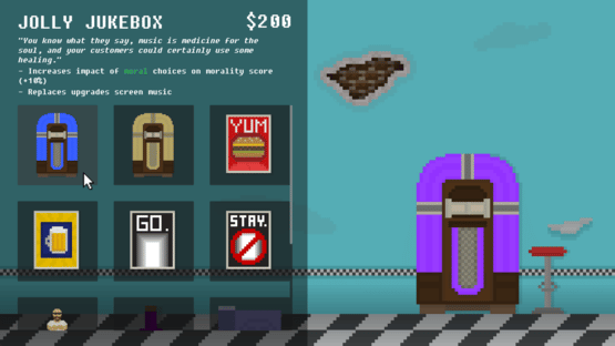 Purgatory Pitstop is a fully-voiced, choice-based narrative game with restaurant management elements. You inherit the only diner on the road to the infamous afterlife gate. Customers arrive at their lowest point, and it's up to you whether to exploit their desperation for profit, try to help them find a better path, or walk an uneasy line between both to keep your struggling business afloat. TALK TO CUSTOMERS - Raise their spirits with some friendly advice and a warm meal, or beat them while they're down and take advantage of their reliance on alcohol? COOK COMFORT FOOD - Win over your customers by cooking them a dish that reminds them of a time, place, or person. Be careful though, physics and food are a messy combination! UPGRADE YOUR DINER - Purchase upgrades that make cooking easier, help you change your morality score, or even assist you in generating more money! PURGATORY PITSTOP - Shape your story through every interaction with the wonderfully weird and wackily woeful patrons of your diner, each of your choices will contribute to a unique ending, to both your story and those of individual customers.