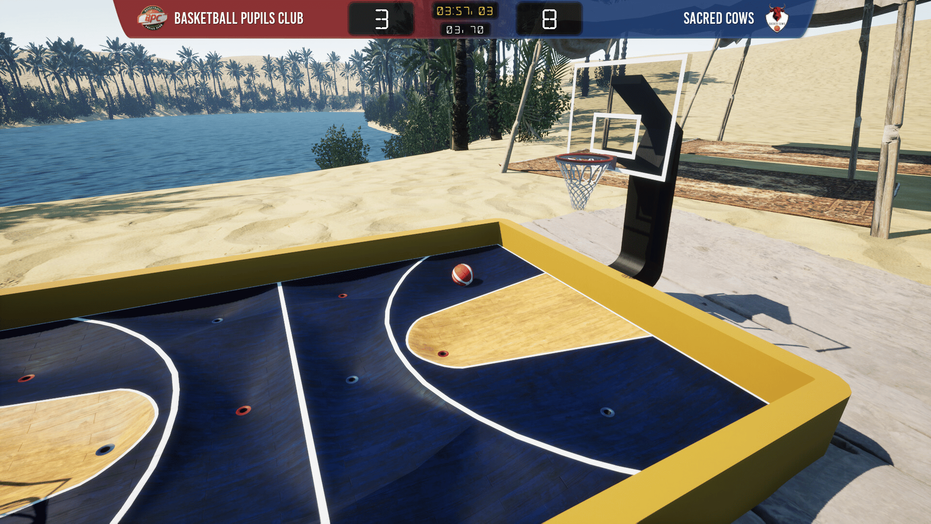 Play tabletop basketball with realistic physics in relaxing environments. Compete in customizable leagues and cups, edit your teams, and complete your trophy room. Collect points to unlock courts, balls, and environments. Play with friends locally or online.