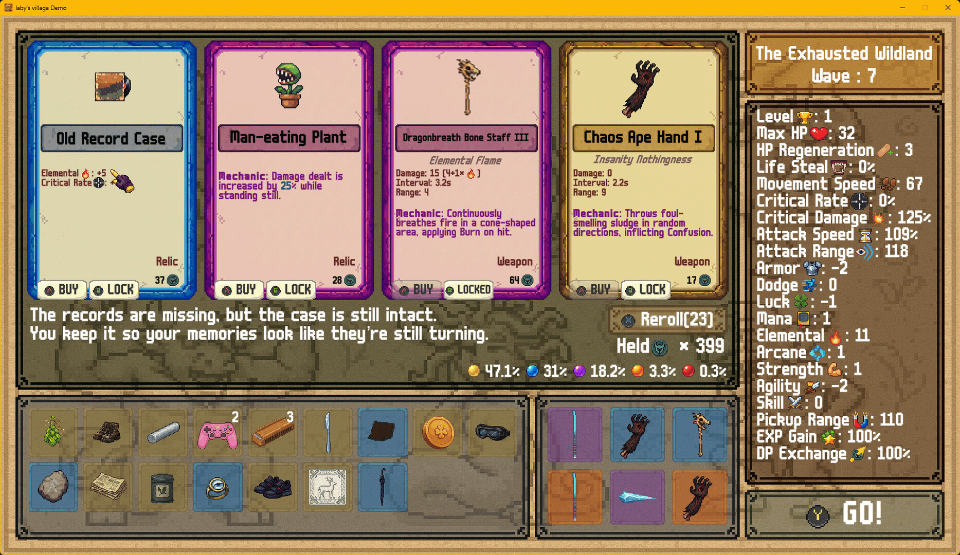 A quirky fantasy 2D pixel roguelite action game. Play as Laby, a goblin officer of the fallen Demon Lord's army, setting out from a small village to subdue ambitious rivals. Combine weapons and relics to forge your own chaotic build and enjoy absurd, fast-paced battles.