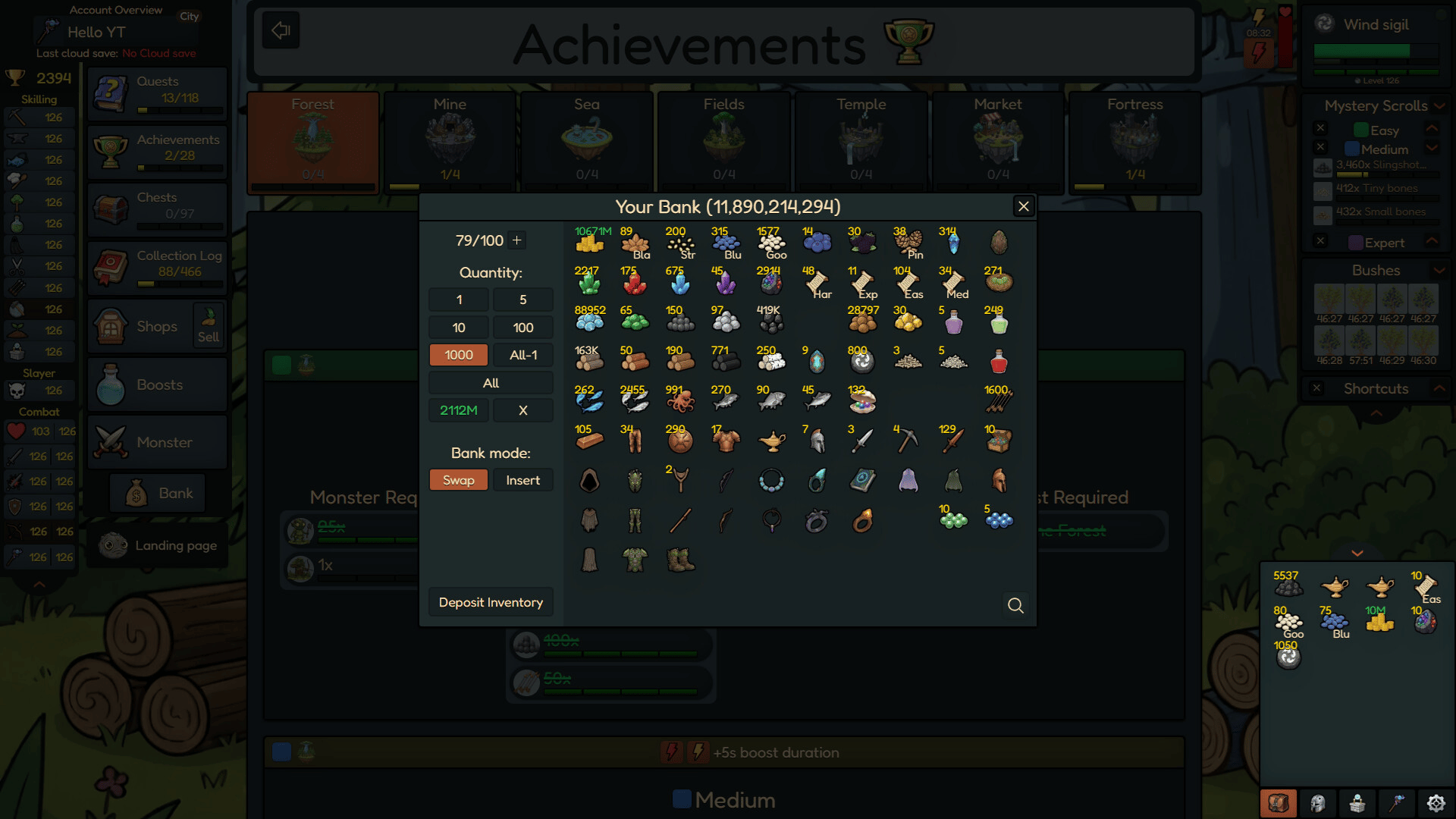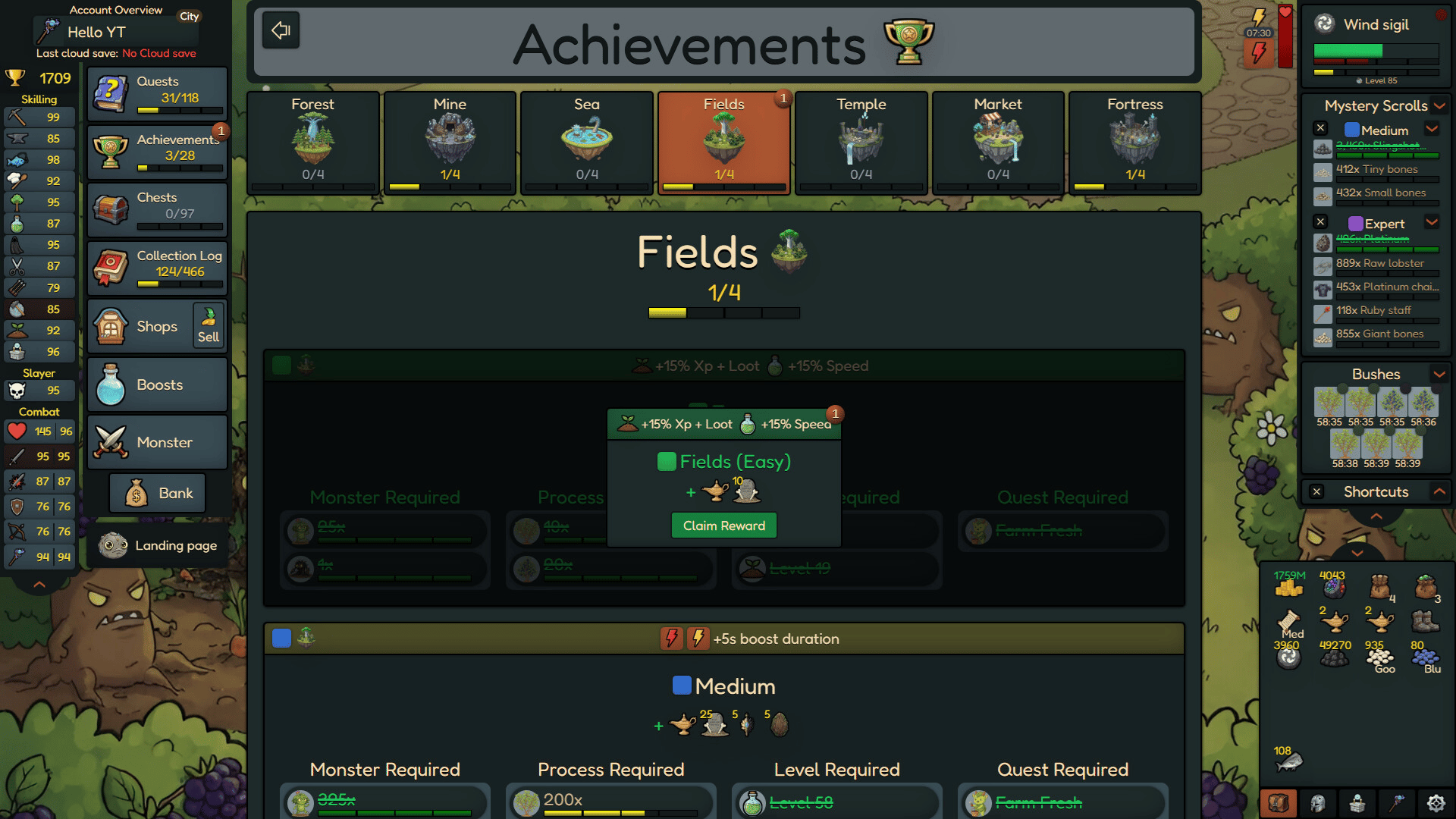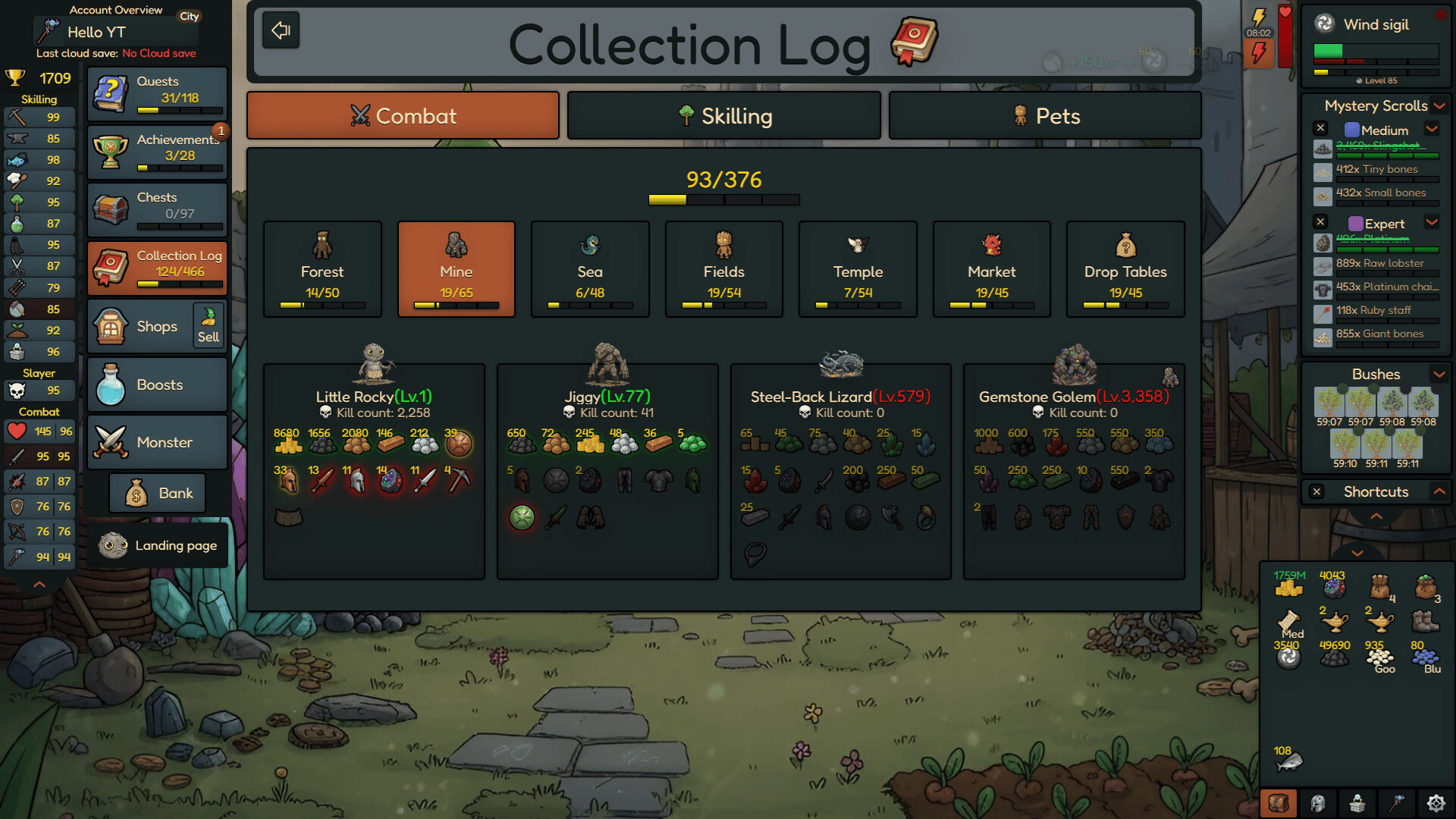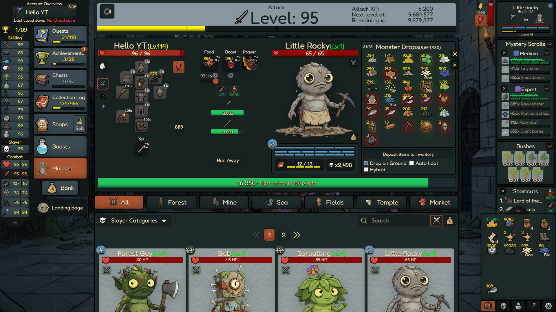Rocky Idle is a single-player idle/incremental game. Level up your skills, gather resources, and craft powerful combat gear to defeat the strongest bosses and complete your collection log.