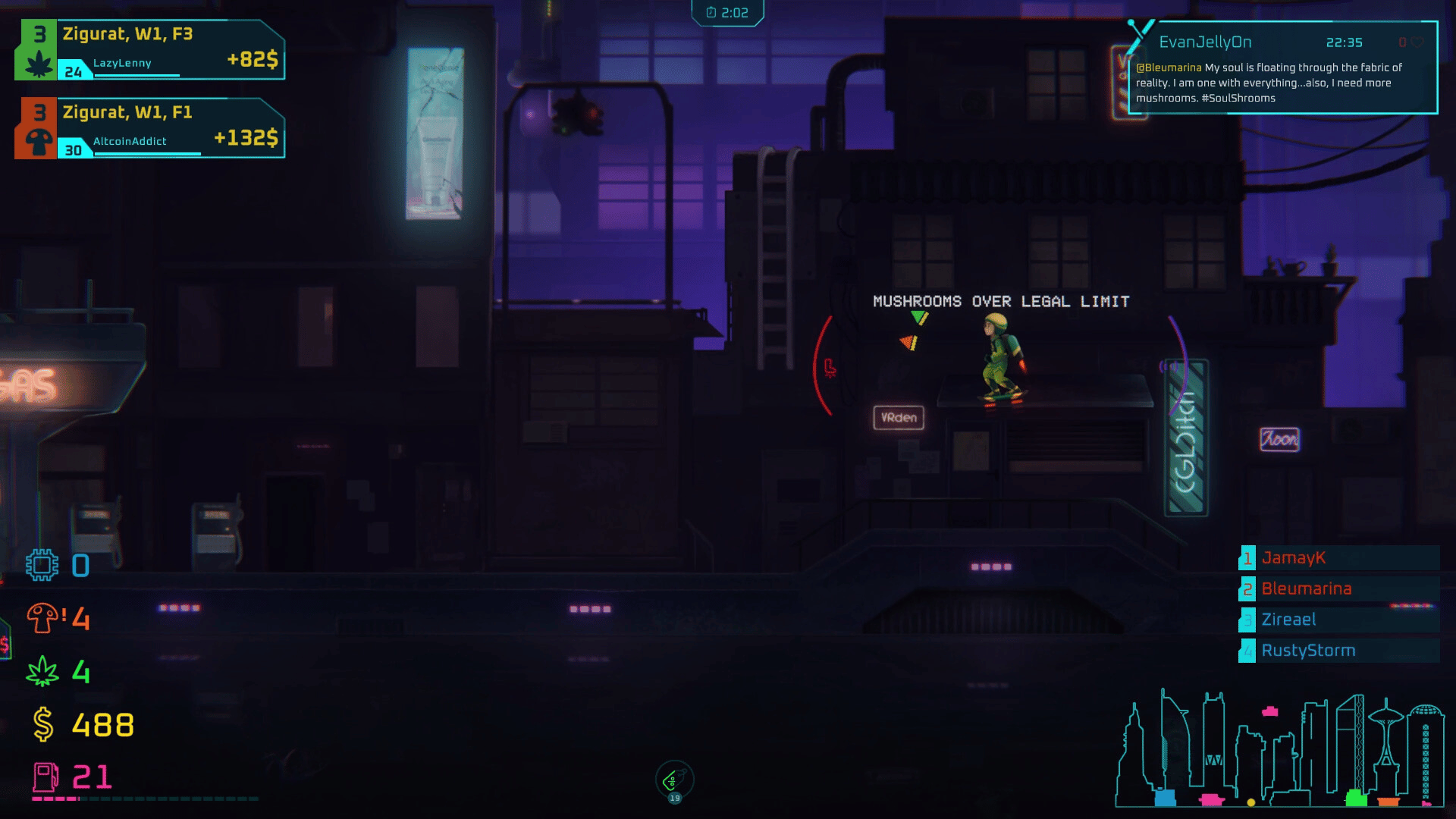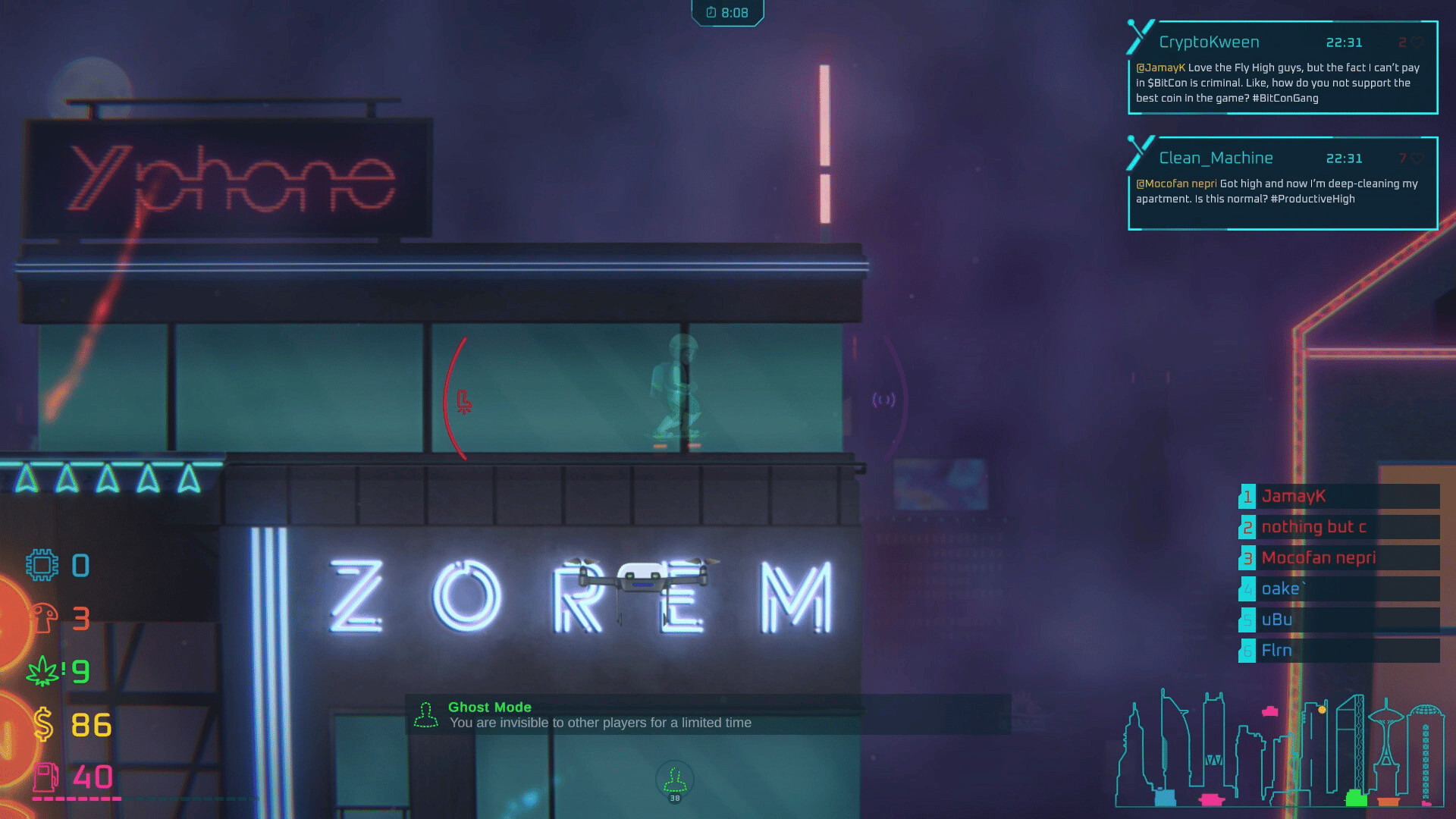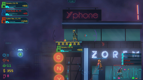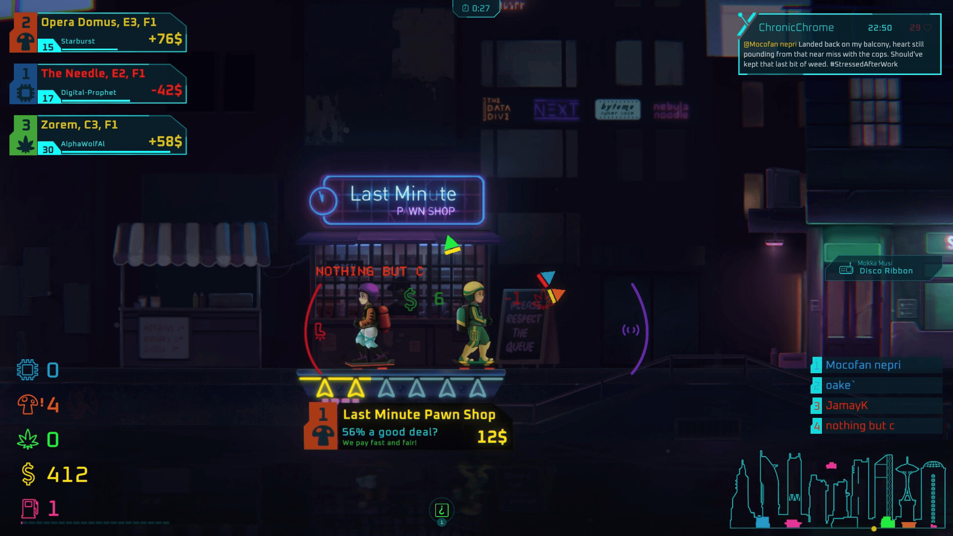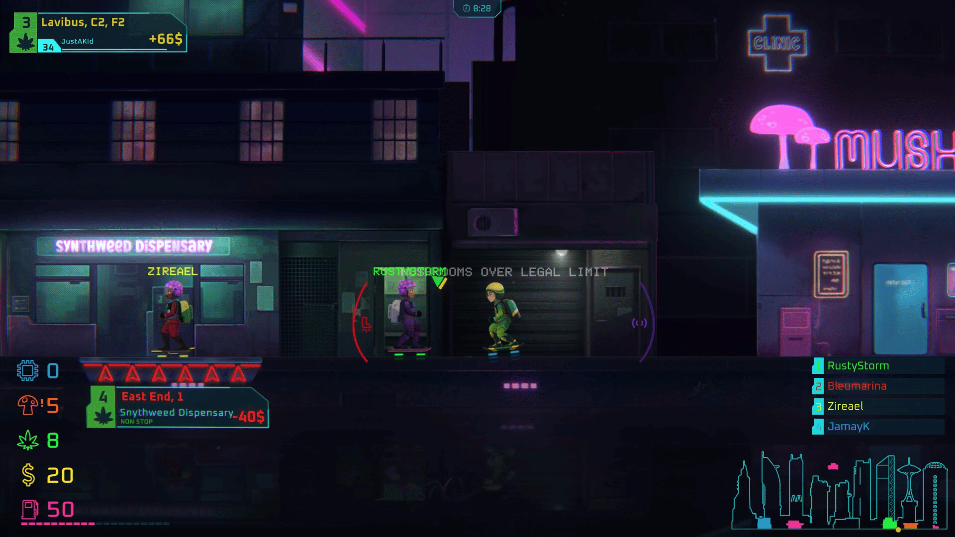 Race against up to five frenemies as jetpack couriers trying to deliver contraband through a pulsing cyberpunk skyline. Master the questionably-engineered flight system, manage fuel & inventory, collect power-ups and EMP blast rivals into cop drones.