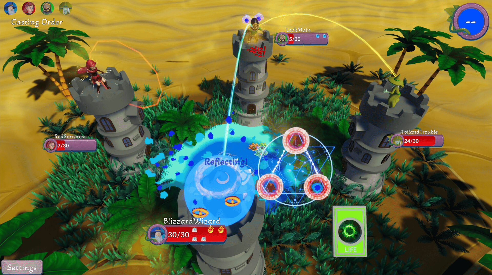 You are an all powerful Wizard. Craft spells from elemental cards. Battle against friends and other Wizards in this turn based party game. Learn deep elemental synergies or lean into wild magic for over the top destruction. Fast paced duels and the luck of the draw ensure no two battles are alike.