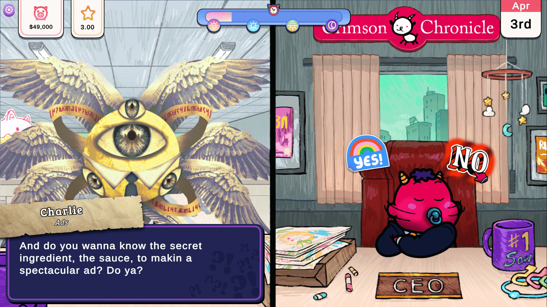 A struggling book company has decided to hire you, a baby, to be the new CEO? All you need to do is manage the budget, keep the company brand strong and make the employees happy. You can't talk? No problem! Give a thumbs up or down and try your best.