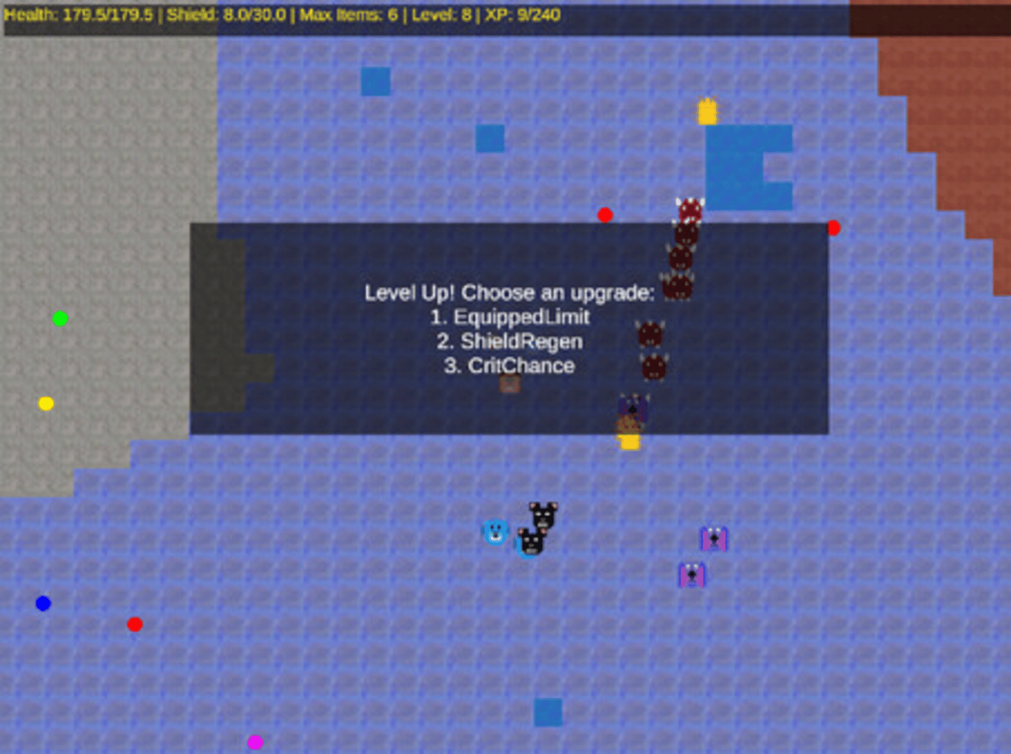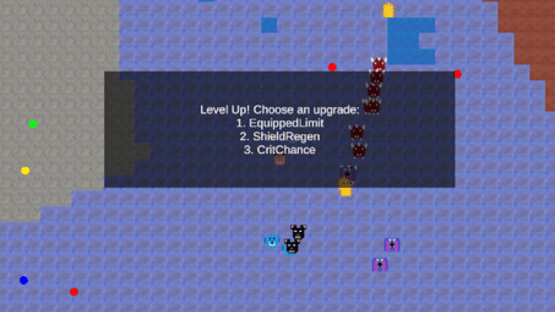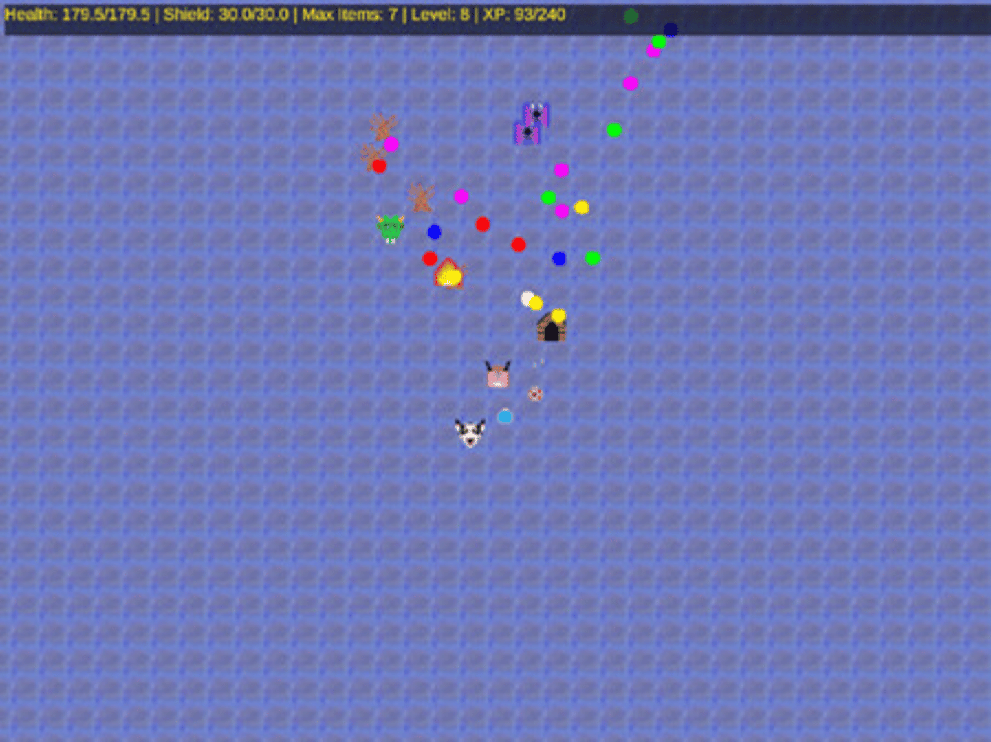 Top down 2D bullet hell survivor. Use your level reached to purchase permanent upgrades to help you get further in the next run!