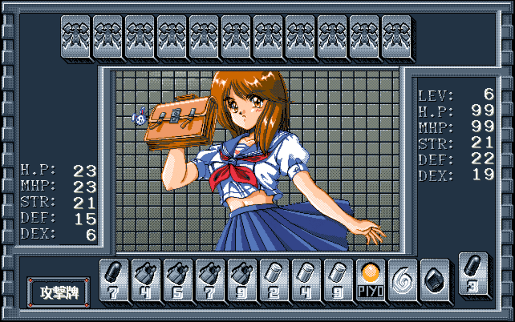 Black Bird is a solo dungeon crawler (with auto-map feature): the gameplay consists of exploring maze-like passages in pseudo-3D environment, fighting randomly appearing enemies. The game features card-based combat. Lightning and his opponent are dealt a deck of cards. The goal is to get rid of single cards and to build combinations (three of a kind, straight, etc.), a bit similarly to a poker game. A successfully built combination inflicts damage on the enemy. There are also defense-strengthening and healing cards, which the player can use between the combinations. Beside that, the game has a traditional RPG system with hit points, experience points, leveling up, money management, equipment, etc.