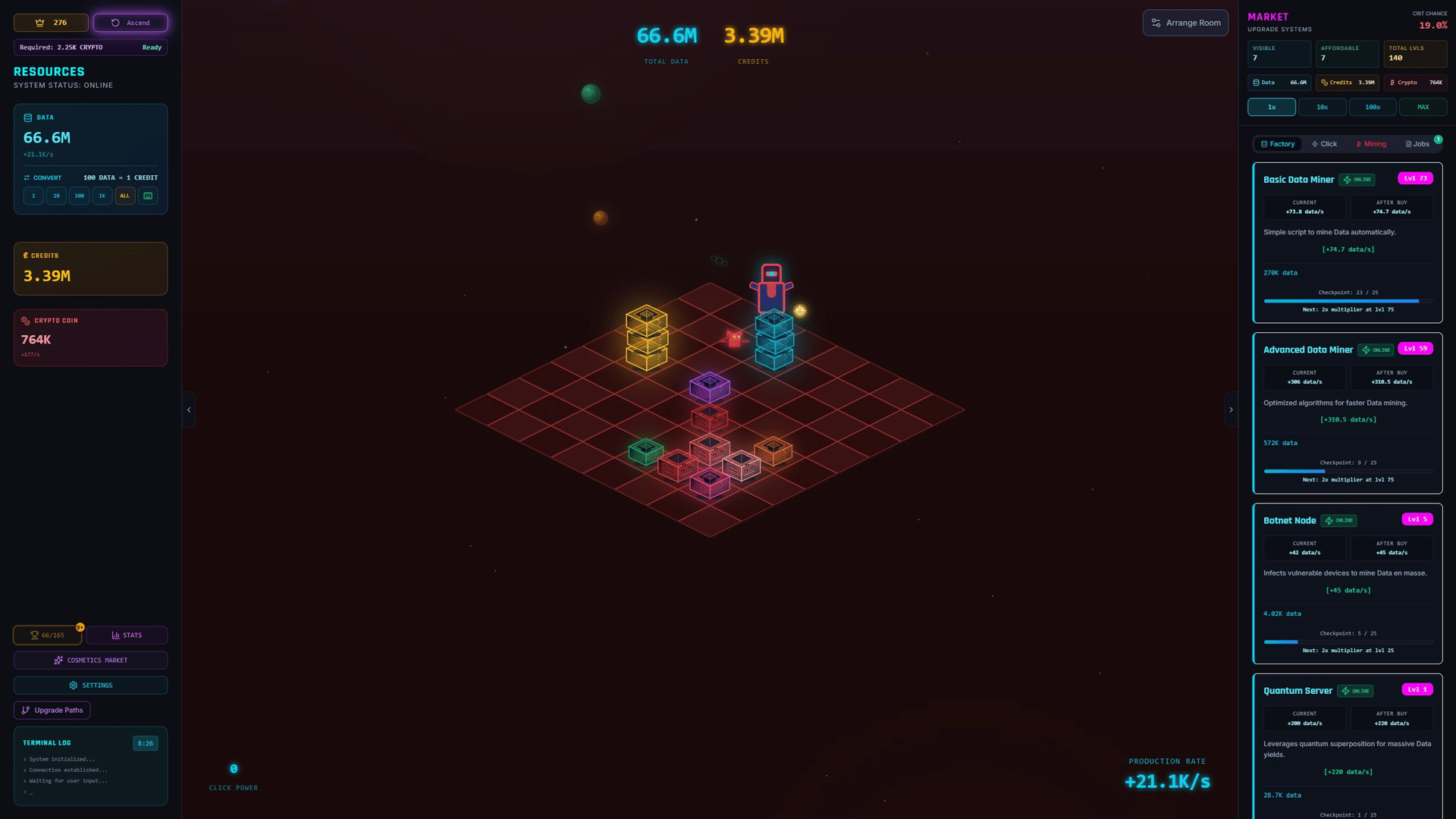 DataFall is a fast-paced cyberpunk action game built around risk, optimization and player decision-making. While it appears to reward min-max strategies, the game dynamically reacts to over-optimization, forcing players to adapt instead of relying on static builds. Featuring neon-styled visuals, escalating difficulty systems and reactive mechanics, DataFall challenges players to balance greed, efficiency and survival.