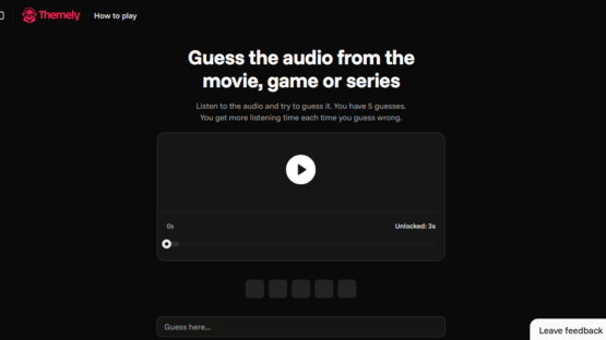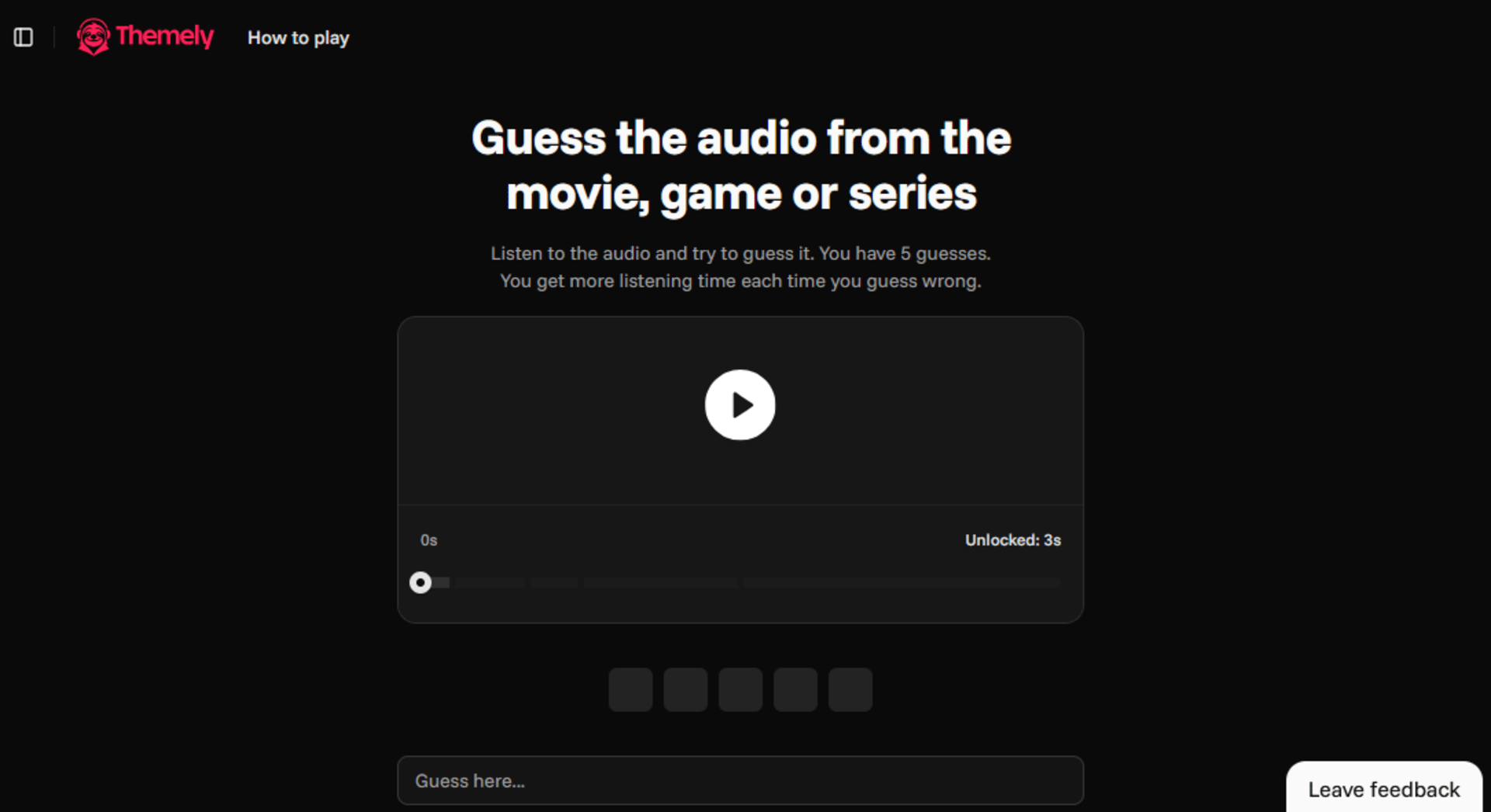 Guess the audio from the movie, game or series Listen to the audio and try to guess it. You have 5 guesses. You get more listening time each time you guess wrong.