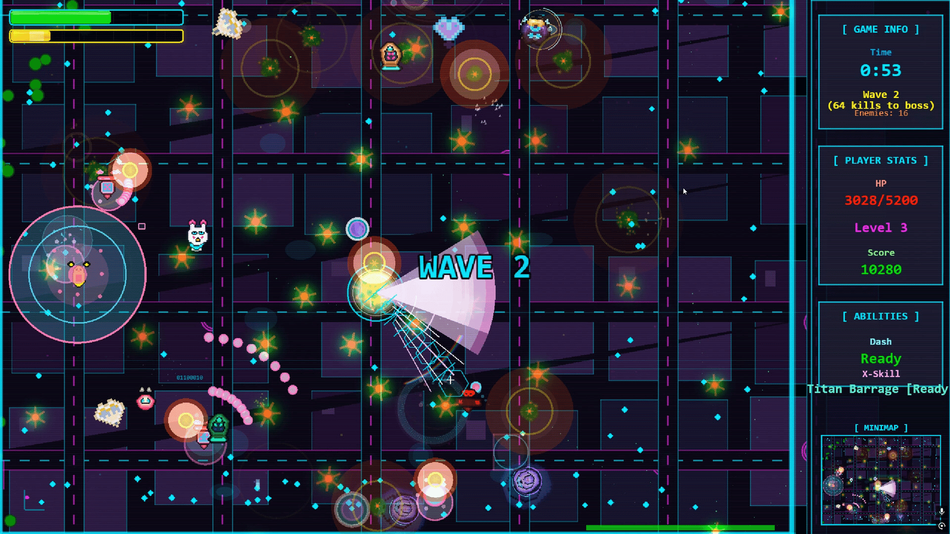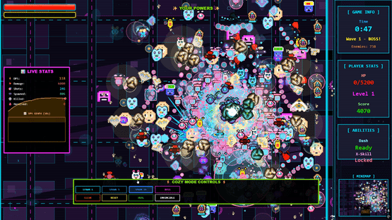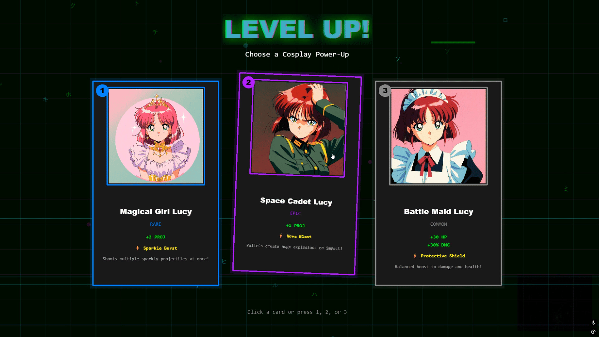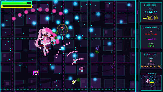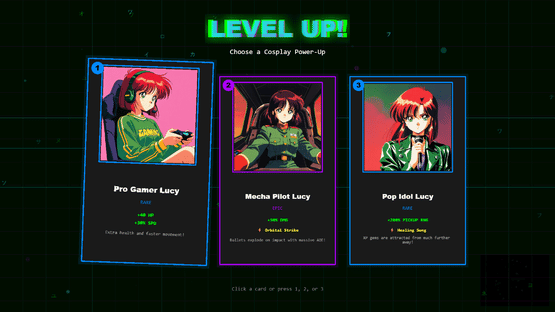 Fight endless enemy hordes in a glitched cyberpunk world as Lucy the cosplayer. This bullet heaven roguelite blends kawaii anime aesthetics with intense top-down survivors-like action. Use cosplay powers to battle waves of corrupted enemies. Pure bullet hell chaos with a touch of 90s anime.