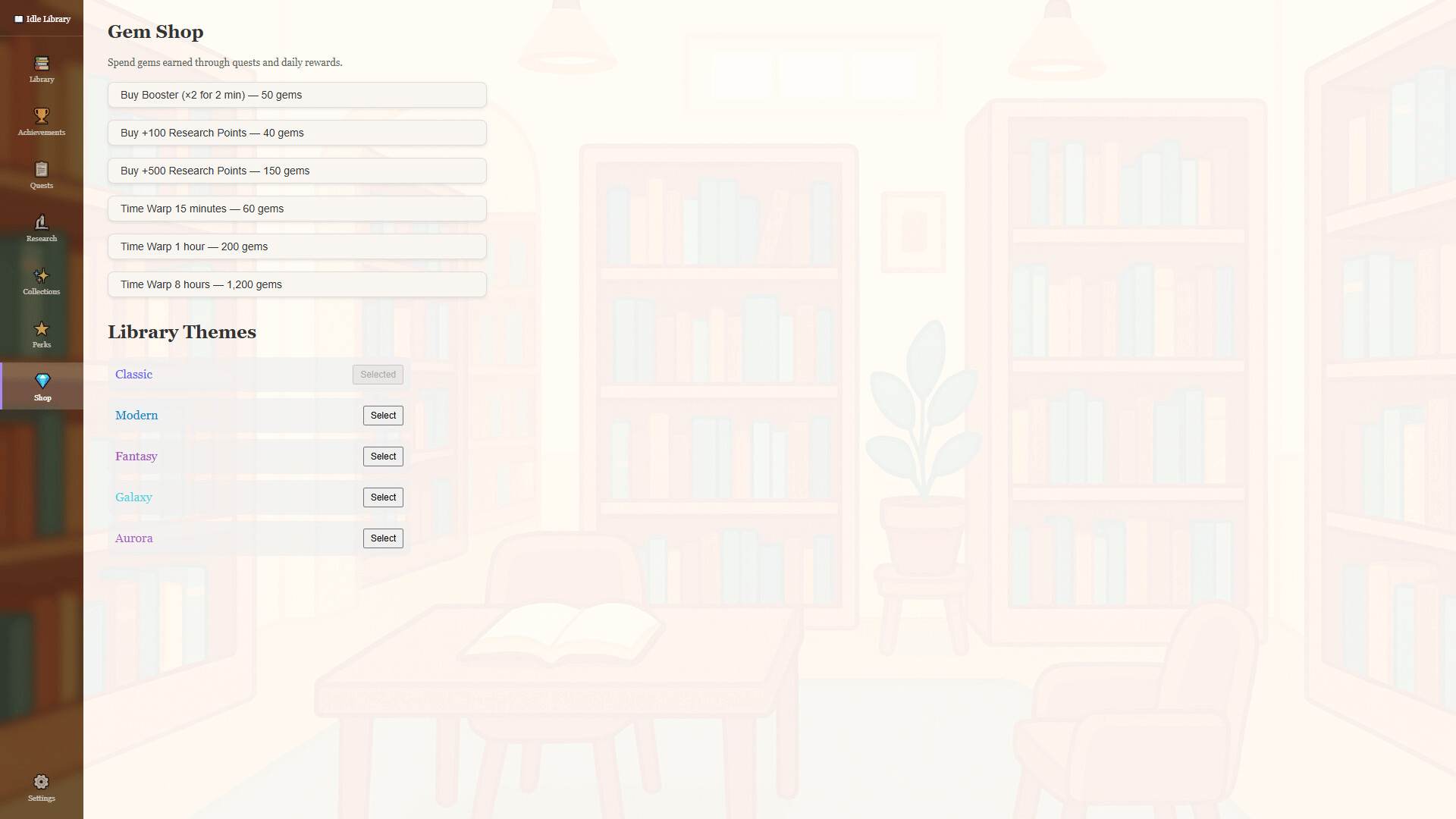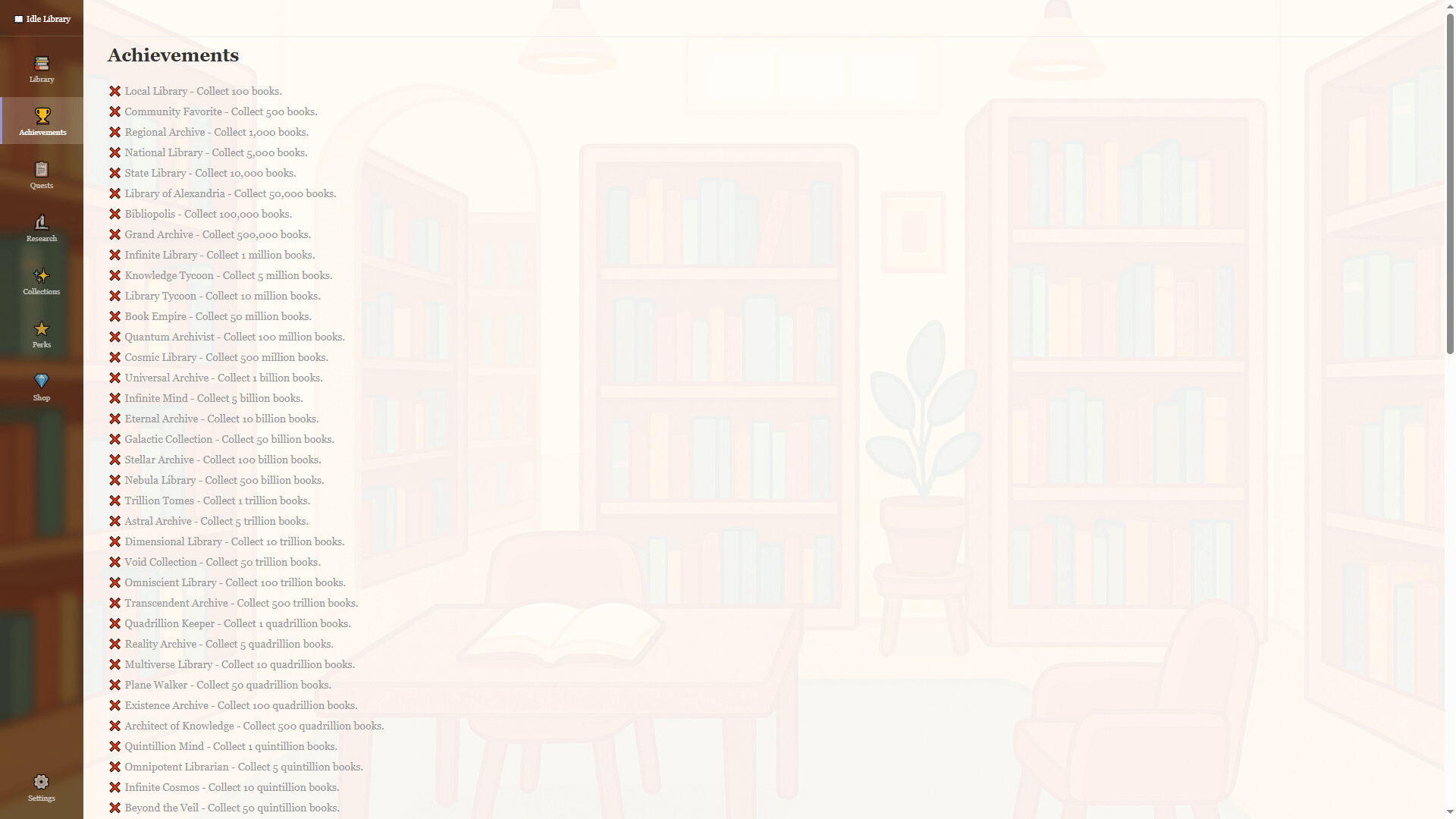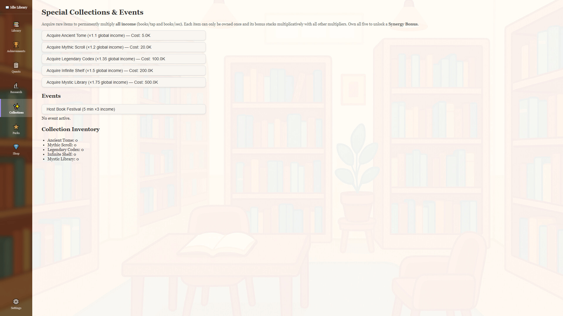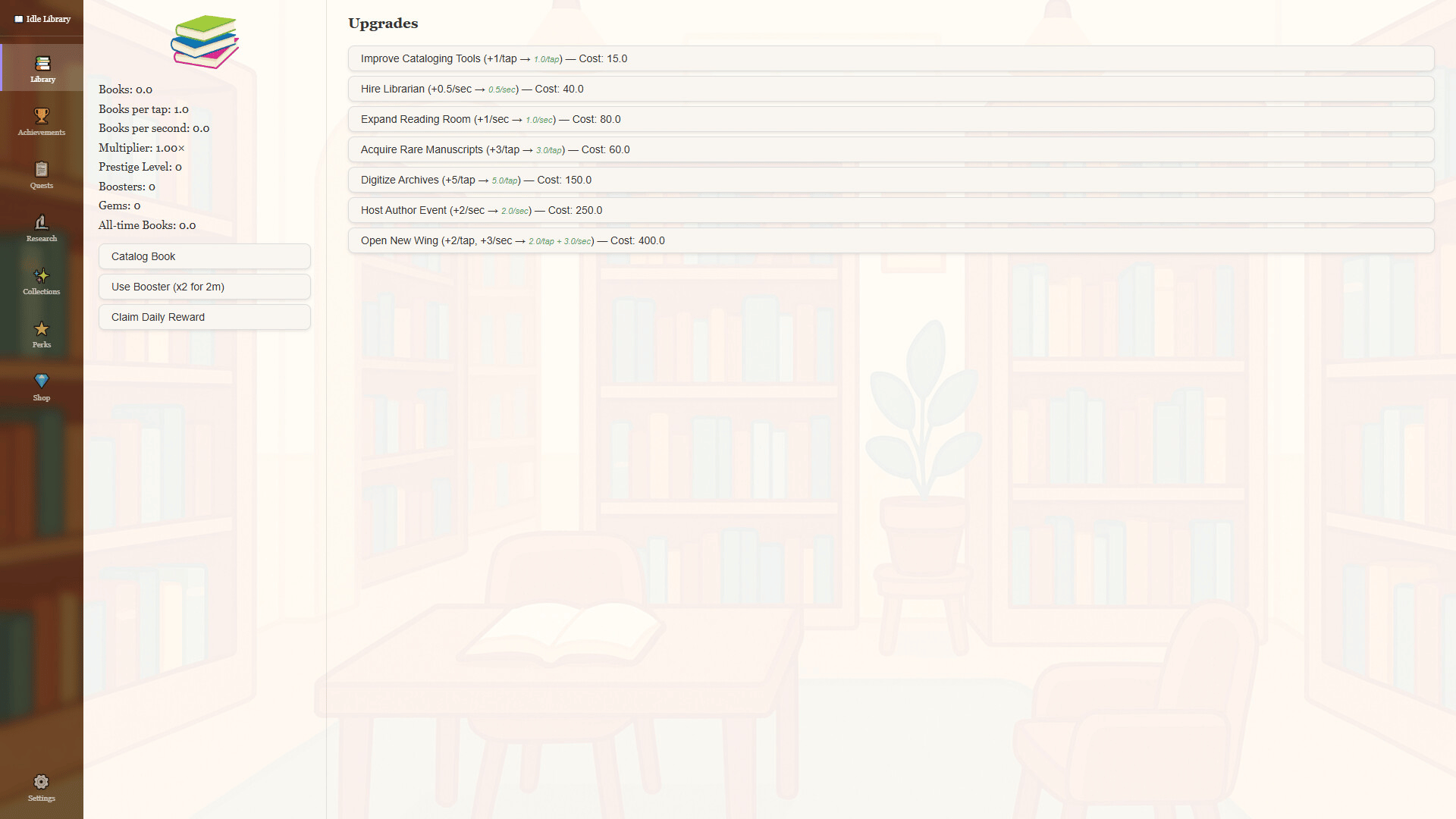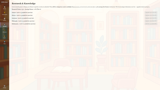 Turn a small reading room into a legendary archive of knowledge in this relaxing idle incremental game featuring research upgrades, prestige progression, and offline growth