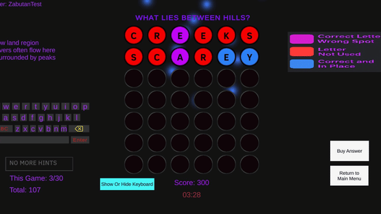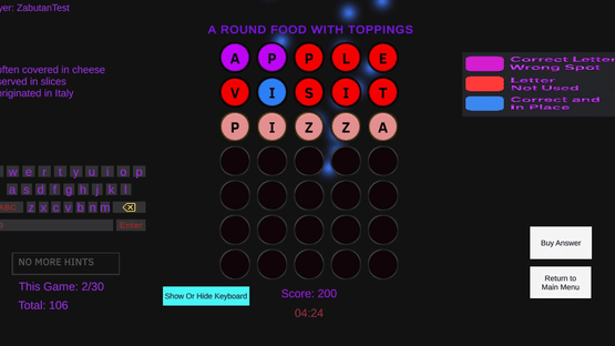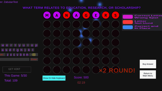 Single-player arcade-style word puzzle with quick-fire rounds, escalating difficulty, and a campaign-style Road to Scholar mode. Unlock tougher clues, chase high scores, enjoy rotating global holiday events, share the guessing with friends, and keep things fresh with original soundscapes.