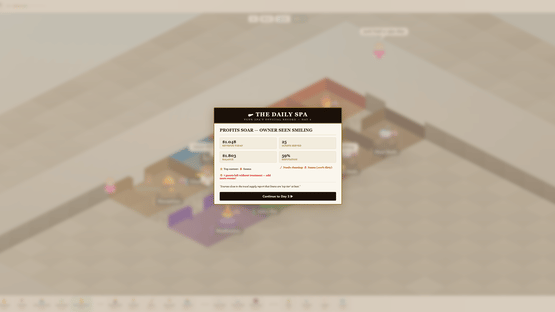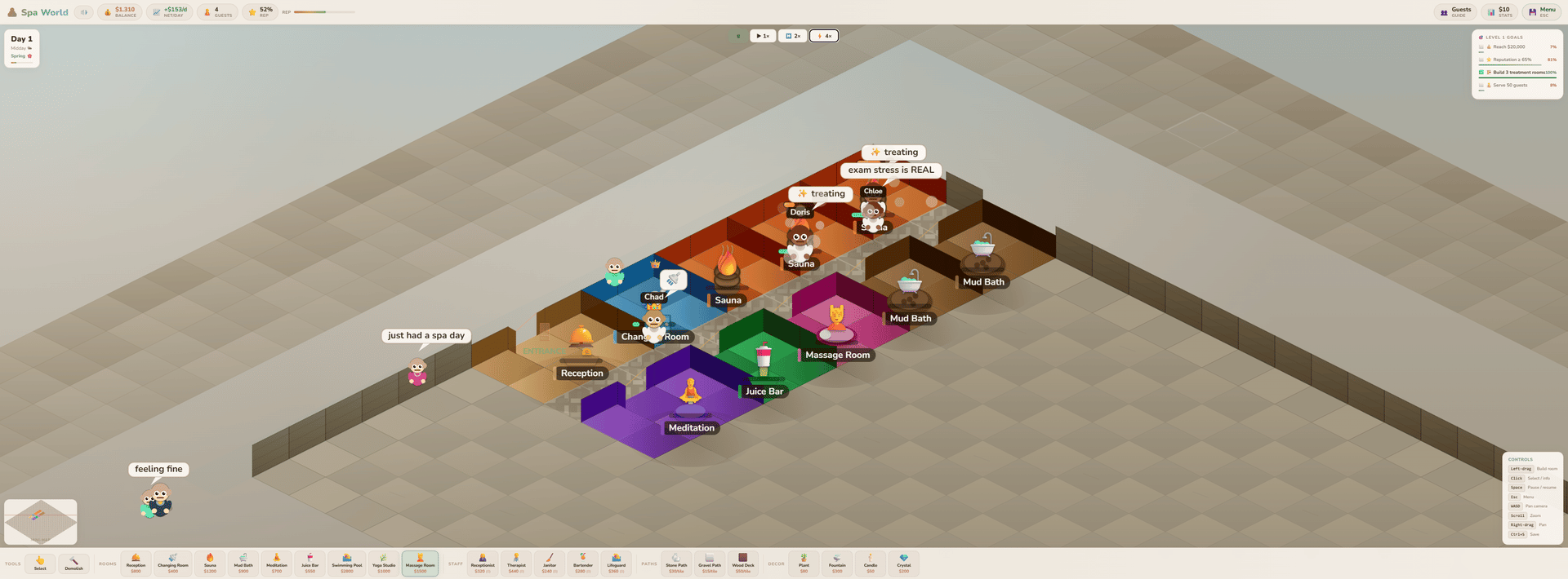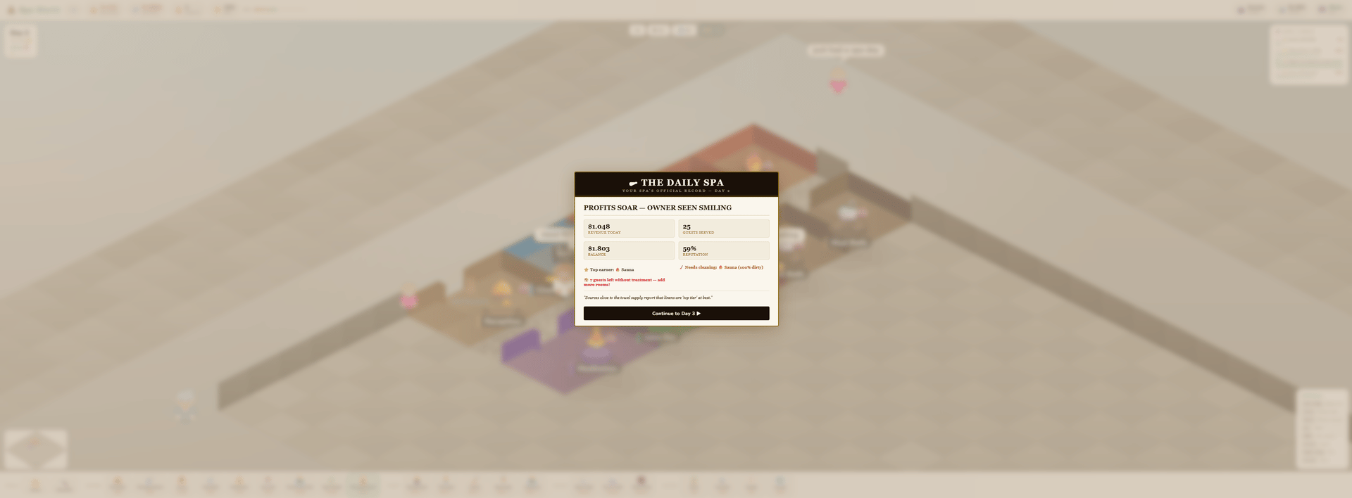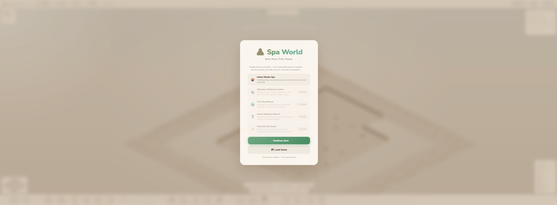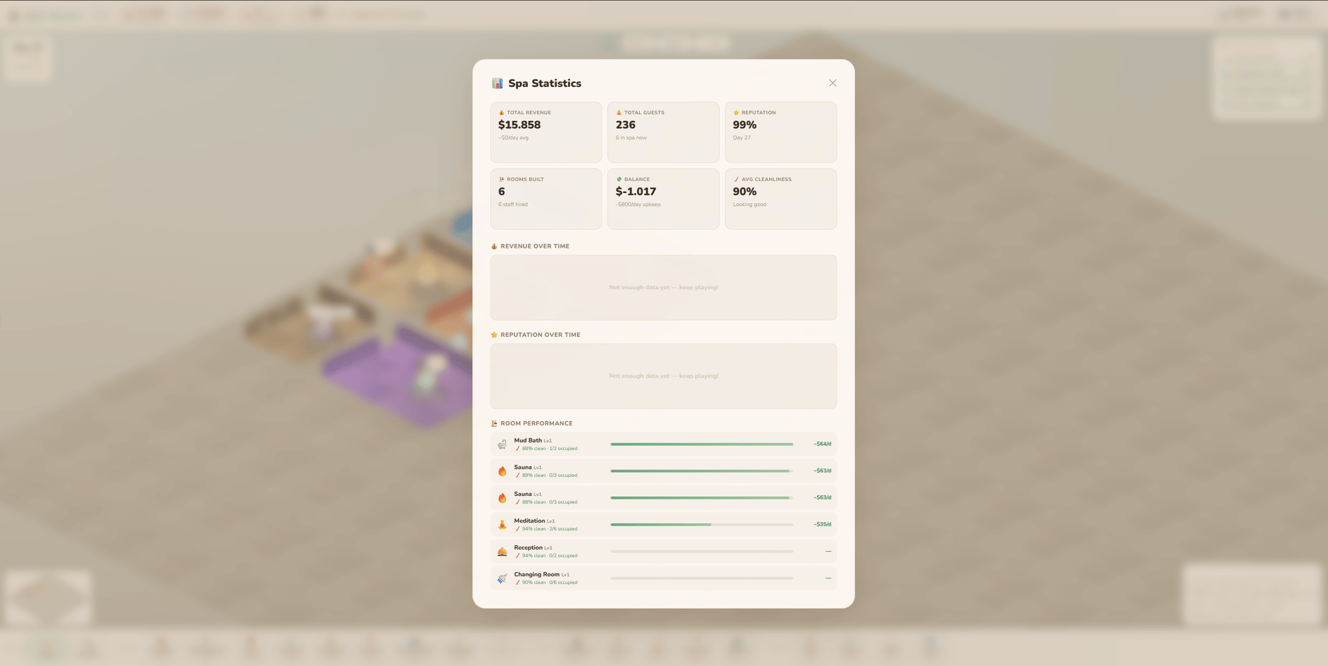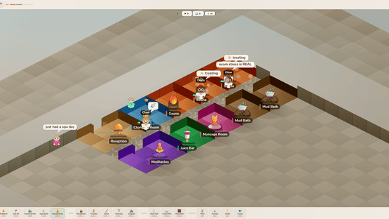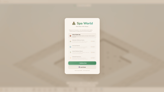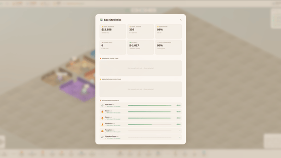Spa World is a cosy isometric management game where you design and run your own wellness centre — from a bare concrete shell to a five-star sanctuary. Drag out rooms, lay stone paths, hire staff, and keep your guests relaxed. Every decision matters: a dirty sauna loses reputation, an understaffed changing room creates a queue, and a VIP who leaves untreated can torpedo your rating overnight.