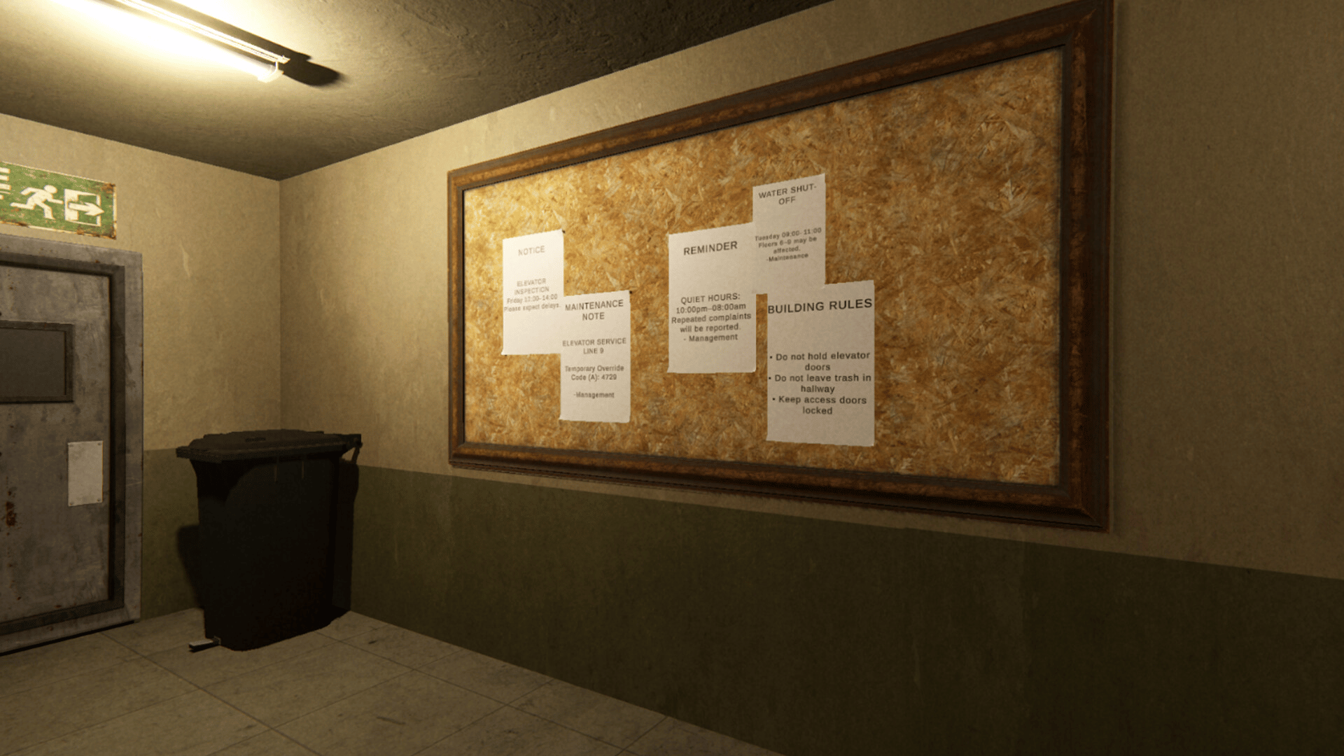 A single-location psychological horror game where the elevator is your safe zone and the hallway is a gamble. Restore Line 9, collect missing service parts, and survive Benjamin’s game.