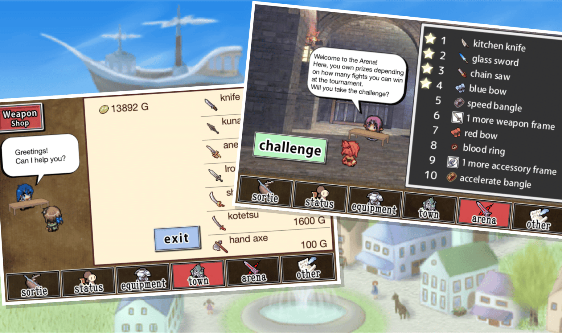 An exhilarating weapon-throwing battle RPG! As clouds stream by, there is turbulence in the air and turmoil on the horizon...Behold, as epic battles unravel here on this island in the sky! Simply tap the screen to play! Fight your enemies by throwing weapons, and destroy the weapons your enemies throw at you! The weapons grow stronger as you use them, and level up during fights — the higher the level, the more unique your techniques will become! Have fun combining weapons and items to create your own strategy! Choose from six characters and master each of their abilities!