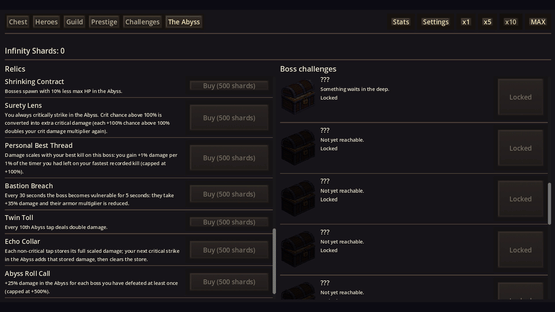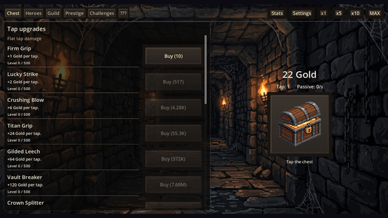 Tap the chest, buy upgrades, and grow a hoard that spirals into absurdity. Hire heroes, fund guild research, and spend Essence on a skill tree that persists between prestiges. When you need a change of pace, race the clock in speed challenges or descend into The Abyss