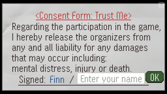 A short-form psychological thriller. Confront the mysterious Finn through a monitor. No strategy or puzzles—just choices and their consequences. Simply answer his questions and witness the end.