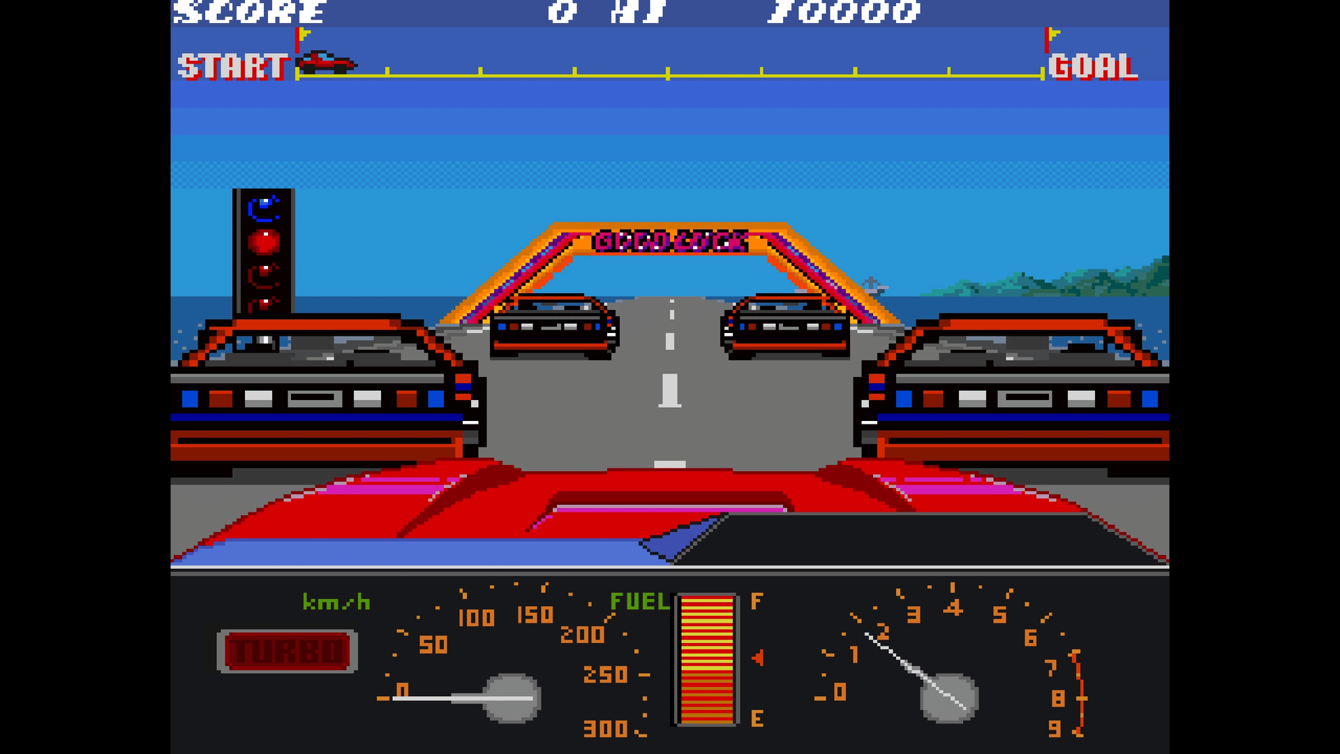 "Konami GT" is a racing game released by Konami in 1985. Keep a close eye on your fuel gauge as you race through checkpoints, aiming to conquer all 6 grueling stages. With beautiful, shifting scenery—from coastal highways and arid wastelands to plains bathed in the sunset—push the pedal to the metal and blast toward the finish line in a shower of glory!