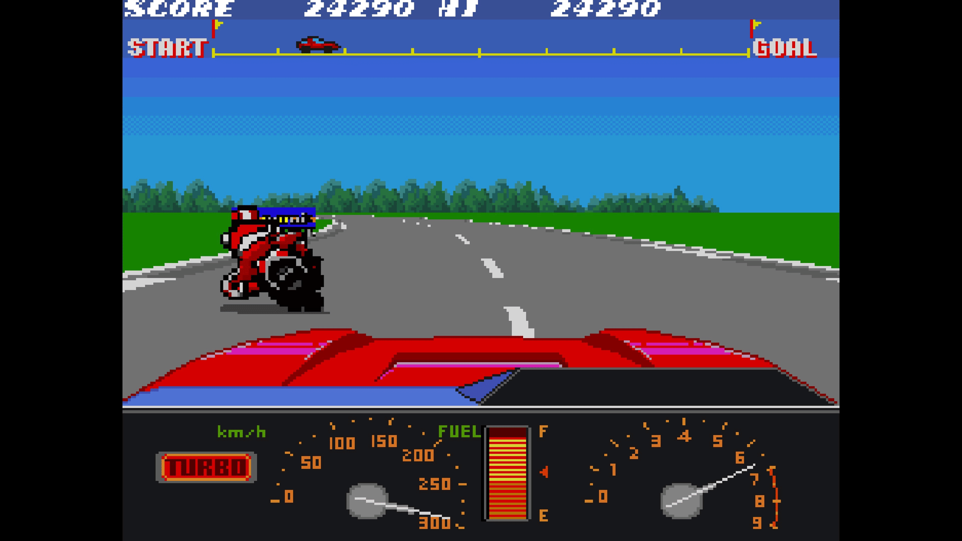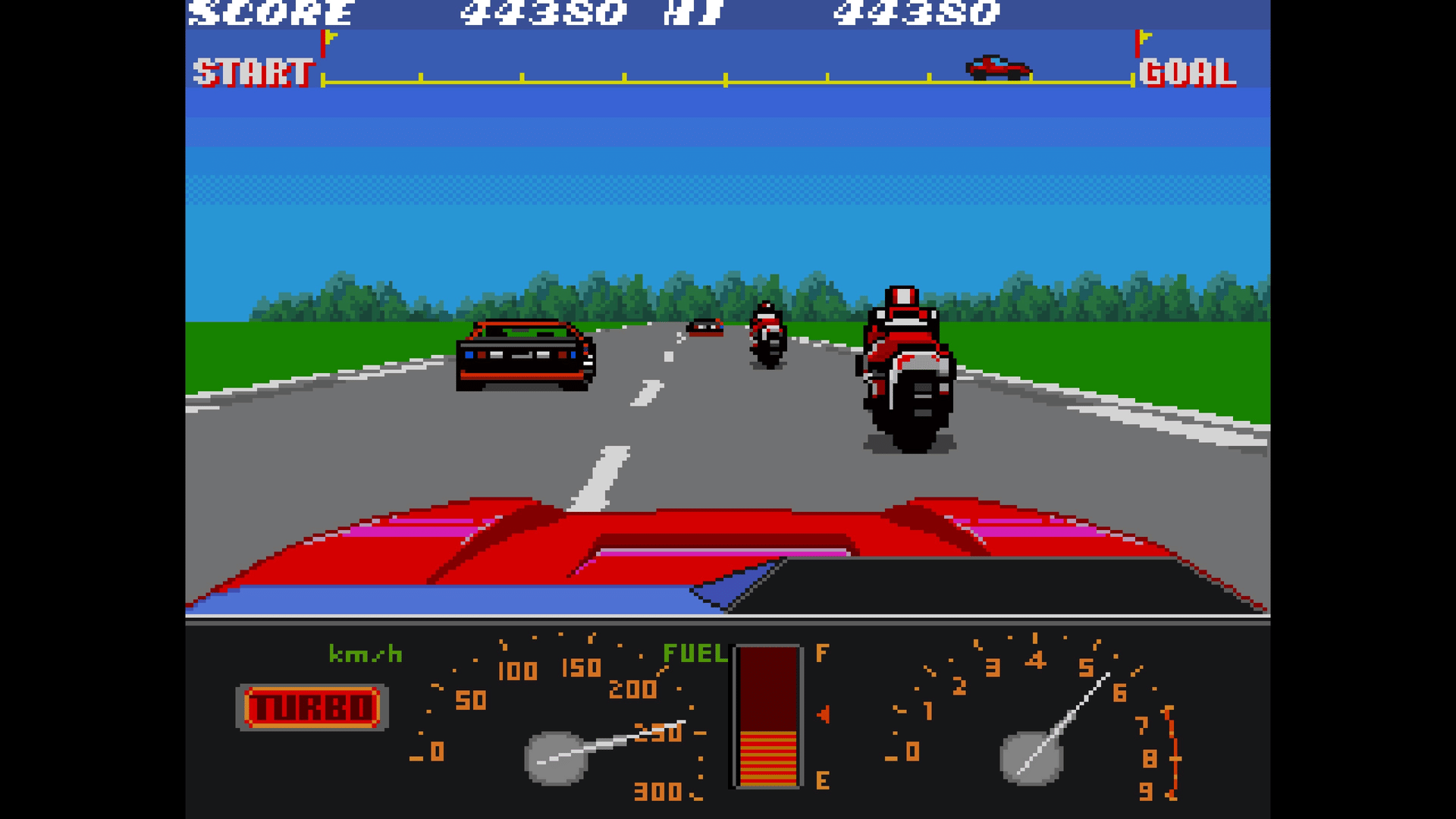 "Konami GT" is a racing game released by Konami in 1985. Keep a close eye on your fuel gauge as you race through checkpoints, aiming to conquer all 6 grueling stages. With beautiful, shifting scenery—from coastal highways and arid wastelands to plains bathed in the sunset—push the pedal to the metal and blast toward the finish line in a shower of glory!