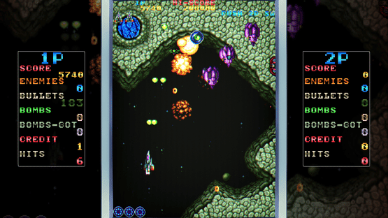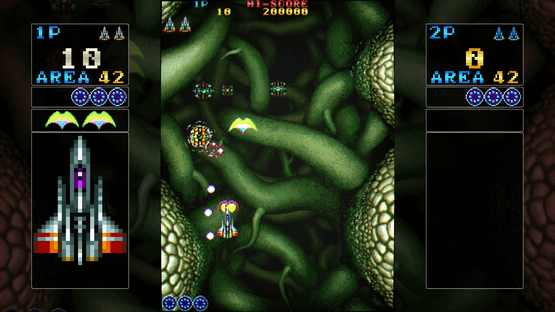 Vimana is one of Toaplan's most unique shooters. The level design is particularly creative, along with a unique charge shot and bombs. It gets its name from the Sanskrit word for "Flying Machine", described in Sanskrit Epics. The storyline involves a planet being attacked by seemingly indestructible alien forces that induce fear and insanity to all that oppose them. The last hope for this planet is the Vimana Warriors, two ships that are empowered by the Hindu god Ganesha to defend against the aliens and restore peace to the galaxy. The Vimana warriors are the player one and player two ships, each equipped with a shot that charges in the shape of a V. Once the shot is released, the V shape explodes forth in an arc, hitting almost everything in front of it. This sounds like it would be a very powerful weapon, but this leads to Vimana's main problem - none of your attacks ever do enough damage. Even the weakest enemies will take more than a few hits to destroy, even if your weapon is fully powered up. Bombs are similarly underwhelming, consisting of seven balls of light that rotate around your ship and guard you from shots. Once an enemy comes onto screen, a light ball will jump out from the group and crash into the enemy, likely destroying or heavily damaging it. Unlike in Fire Shark, where you can pick up new weapons, Vimana does not offer any weapons other than standard shots, charge shots, and bombs. Vimana has some bits of creativity in its levels. One in particular has moving enemy searchlights, which will fire hard to dodge bullets if it spots you. An interesting boss fires from the bottom of the screen as opposed to the top. Vimana also attempts to squeeze around 50 enemy bullets on screen at once, making it feel like a sort of prototype bullet hell shooter. Vimana was never ported to any home systems, but like Out Zone it would not have really fit onto any of them very well. The music was done by Toshiaki Tomizawa, who would later go on to make soundtracks for Fixeight, another Toaplan shooter and many of Cave's games, including Dodonpachi, Progear, Guwange, and ESP Ra. De..