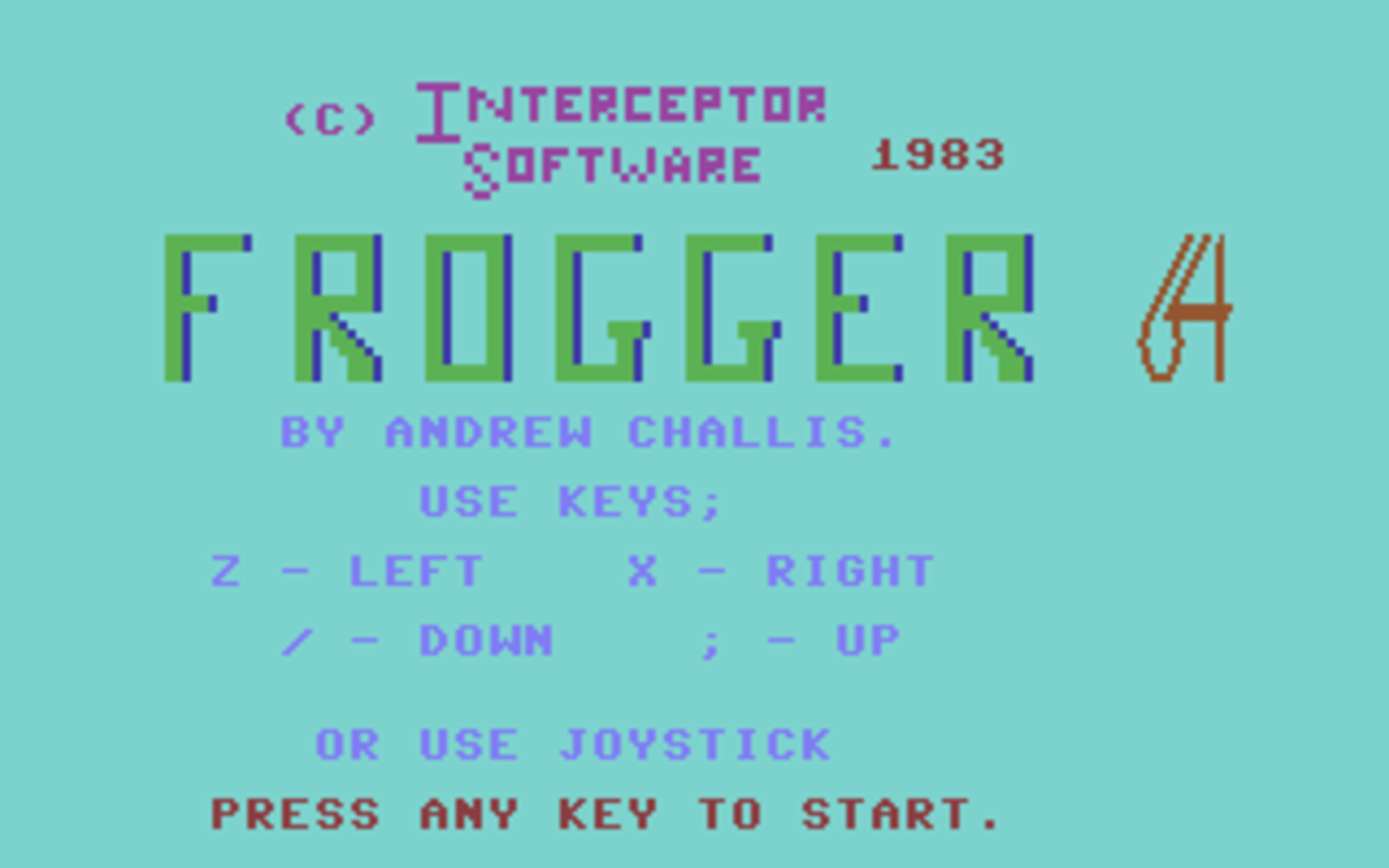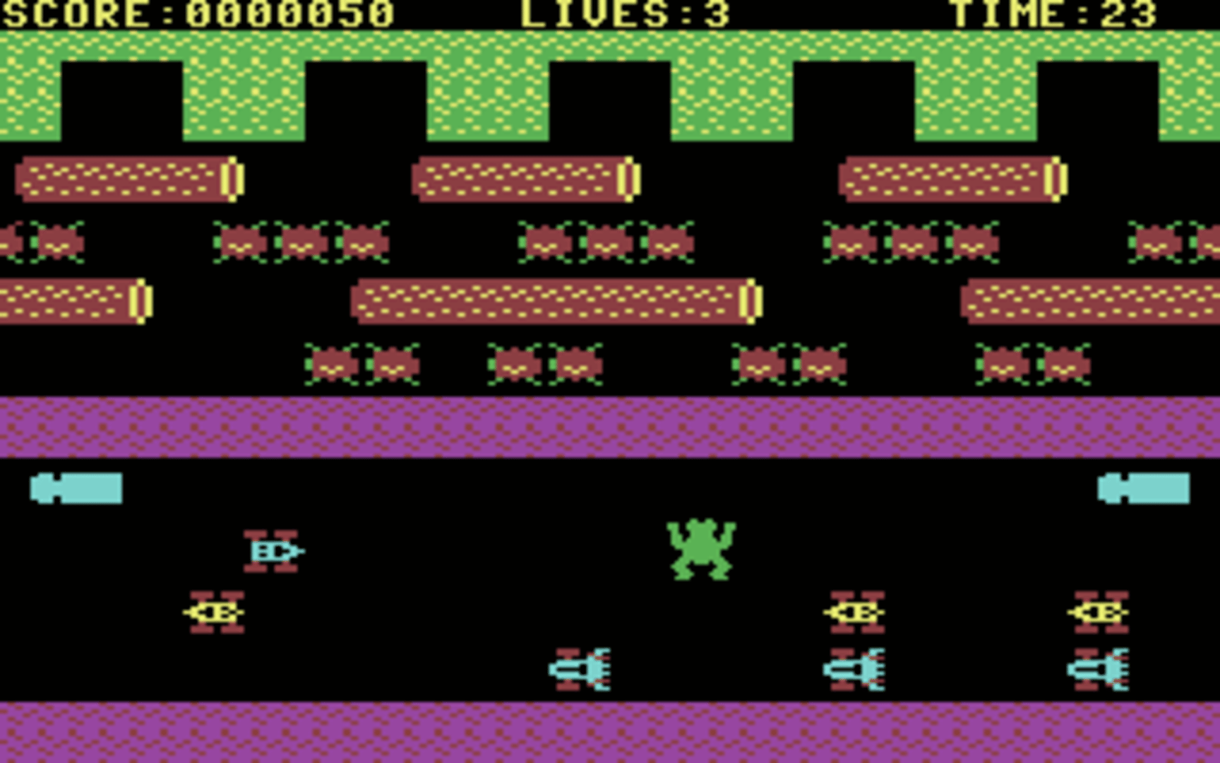 Your task in this arcade conversion is to guide a frog across a treacherous road and river, and to safety at the top of the screen. Both these sections are fraught with a variety of hazards, each of which will kill the frog and cost you a life if contact is made.