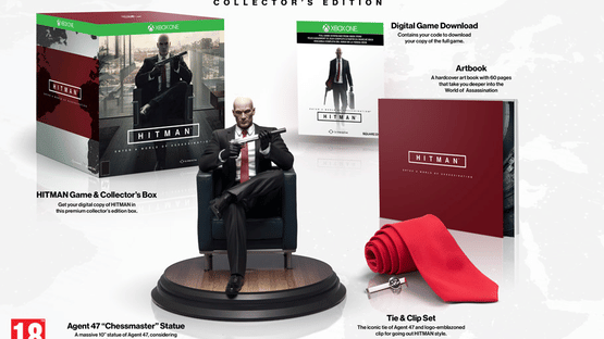 HITMAN Game and Collector's Box - Get your copy of HITMAN in this premium collector's edition box Agent 47 "Chessmaster" Statue - A massive 10" statue of Agent 47, considering his next checkmate Tie & Clip Set - The iconic tie of Agent 47 and logo-emblazoned clip for going out in HITMAN style Art book - A hardcover art book with 60 pages that take you deeper into the World of Assassination Digital Game Download - Contains your code to download your copy of the full game