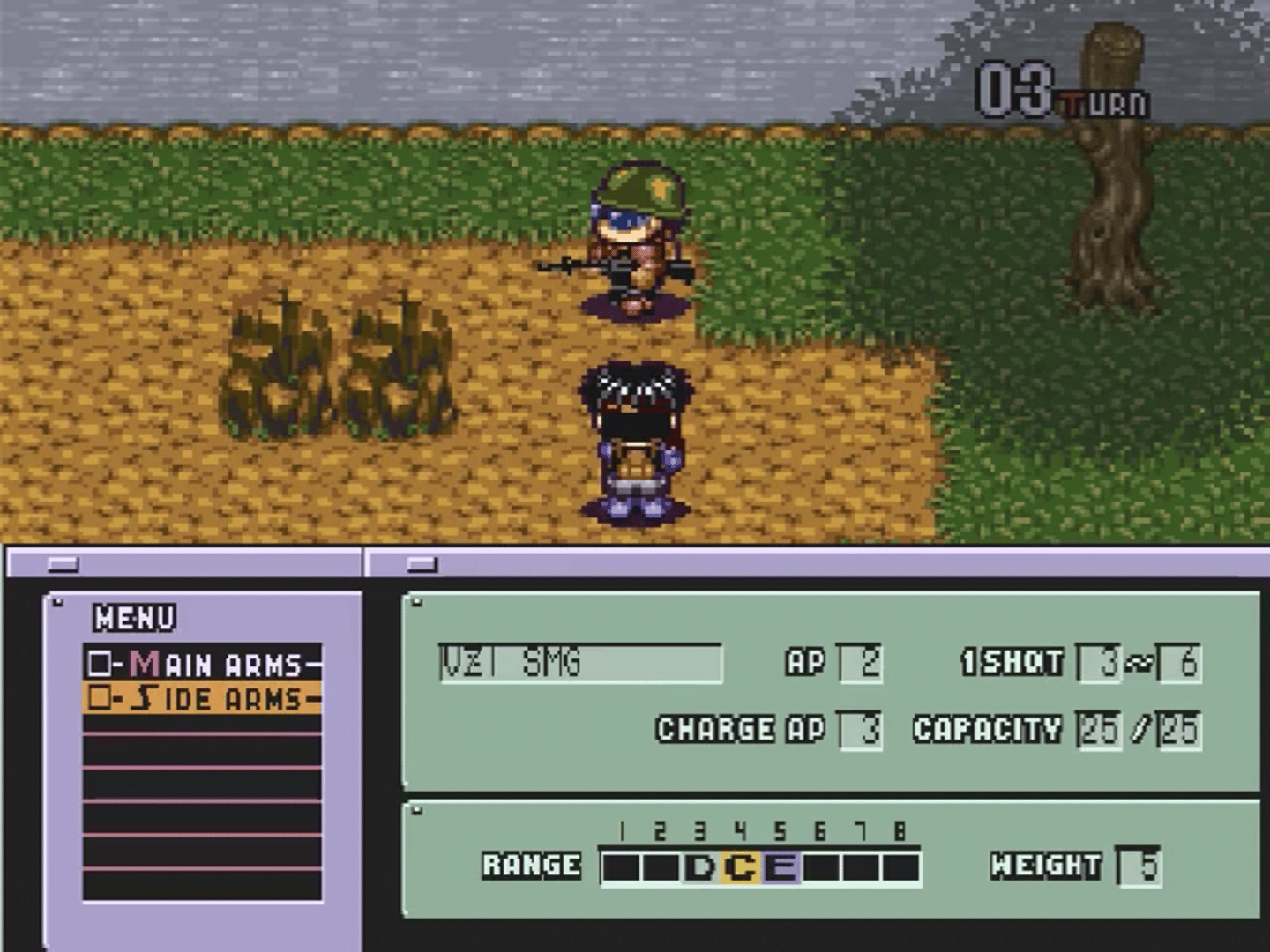 A turn-based strategy game based on paintball simulation battles. Ball Bullet Gun: Survival Game Simulation is a Japan-exclusive turn-based strategy game for the Super Famicom. The game allows the player to create a party of "soldiers", though the implication is that these are regular civilians taking part in a military simulation, and determine their names, faces and loadouts. The player then takes this team through a series of missions, using whichever members best fit the criteria. The game makes heavy use of fog of war, making it impossible to see the enemy's team unless they get within visual range. The player characters can use cover and change the direction they're facing, which allows them to get the drop on enemies. Everything - movement and reloading or shooting a weapon - requires a finite number of "AP" that replenishes after each turn. Both sides take turns to be the remaining team on the field.