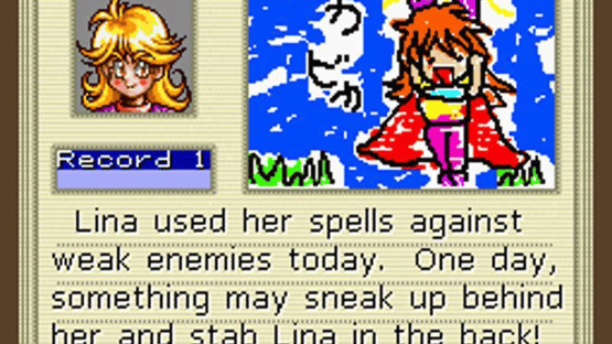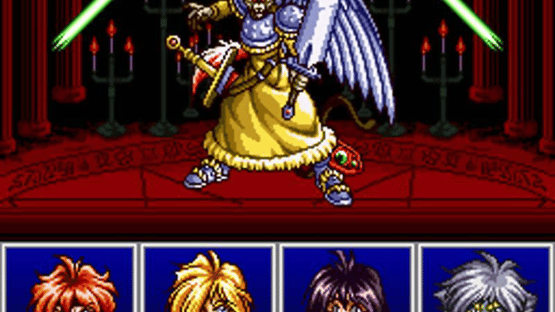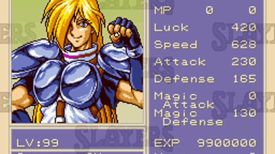 Slayers is a role-playing video game adaptation of the Slayers light novel series developed by BEC and published by Banpresto for the Super Famicom (SNES) exclusively in Japan in 1994. Powerful, avaricious sorceress Lina Inverse travels around the world, stealing treasures from bandits who cross her path. Her latest victims, a band of thieves, wait in ambush in a forest, thirsting for revenge. When Lina is about to effortlessly pummel her would-be attackers, the swordsman Gourry Gabriev suddenly announces his presence. Assuming Lina to be a damsel in distress, the foolish yet magnanimous man confronts the brigands in order to rescue her. After defeating them posthaste, the oblivious cavalier decides to escort Lina to Atlas City. Though not very keen on this idea, she ends up accepting his offer. However, without realizing it, Lina has chanced upon a mighty magical item among her most recent spoils. Now two mysterious men are hunting the young magician and her self-proclaimed guardian to obtain this powerful object for apparently nefarious purposes. This way they begin their adventure, one where the fate of the world itself may be at stake.
