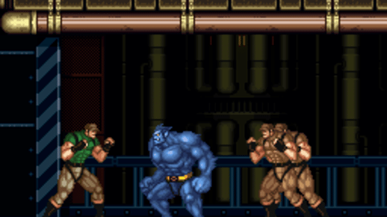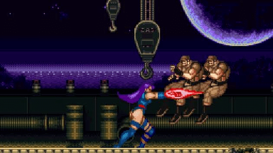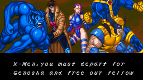 Because of a rise of anti-mutant activity in Genosha, Professor Xavier uses Cerebro to scan the island nation and discovers Apocalypse's presence there. Genosha's government is apparently using Apocalypse to bring their mutant population under control. However, Xavier suspects Apocalypse to follow his own plans and sends five X-Men, Cyclops, Wolverine, Psylocke, Beast and Gambit, to investigate. X-Men: Mutant Apocalypse combines the gameplay of a side-scrolling brawler like Final Fight with elements of a platformer, that is, players have to fight various enemies and survive the occasional jumping-puzzle. Most levels also feature mid- and end-bosses in form of robots, monsters or known Super-Villains. Each character has unique abilities and special moves: Cyclops uses his Optic Blast to attack enemies from a distance, Wolverine can climb walls, Psylocke is very agile and the best jumper of the team, Beast can cling to the ceiling while Gambit throws explosive cards at his enemies. Special moves are quite similar to those found in Street Fighter II (Wolverine has a Dragon-Punch-style attack and Gambit's Double Kick is virtually identical to M. Bison's Scissors Kick), and require similar button combinations. While most stages are unique for each character, some can be played with any of the X-Men. Progress is saved via password.