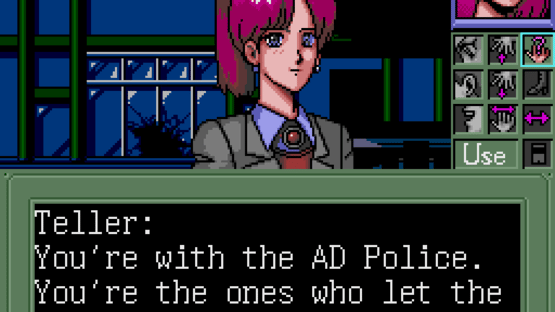 Bubblegum Crash is a PC Engine graphic adventure game based on the anime OVA series of the same name. The anime/game is set in the near future of 2032, which has seen Tokyo split into two by a massive earthquake. Corporations rule the country, production-line humanoid robots named "boomers" are being used by villains to commit crimes, and the beleaguered police are too under-budgeted and incompetent to handle it all. The all-female mercenary team the Knight Sabers, who use powerful exosuits called "Hard Suits", are the city's best defense. The game operates similarly to other adventure games of the era. The player is given a selection of commands that they can use to interact with the world, including talking to NPCs, picking up and using objects in their inventory and moving to other areas. At any time the player can look and listen for extra context clues. The commands are in English, but the game's story and dialogue text is entirely Japanese. The game will occasionally switch protagonists, starting with Nene Romanova and moving to Priss, Linna and Sylia at various points.