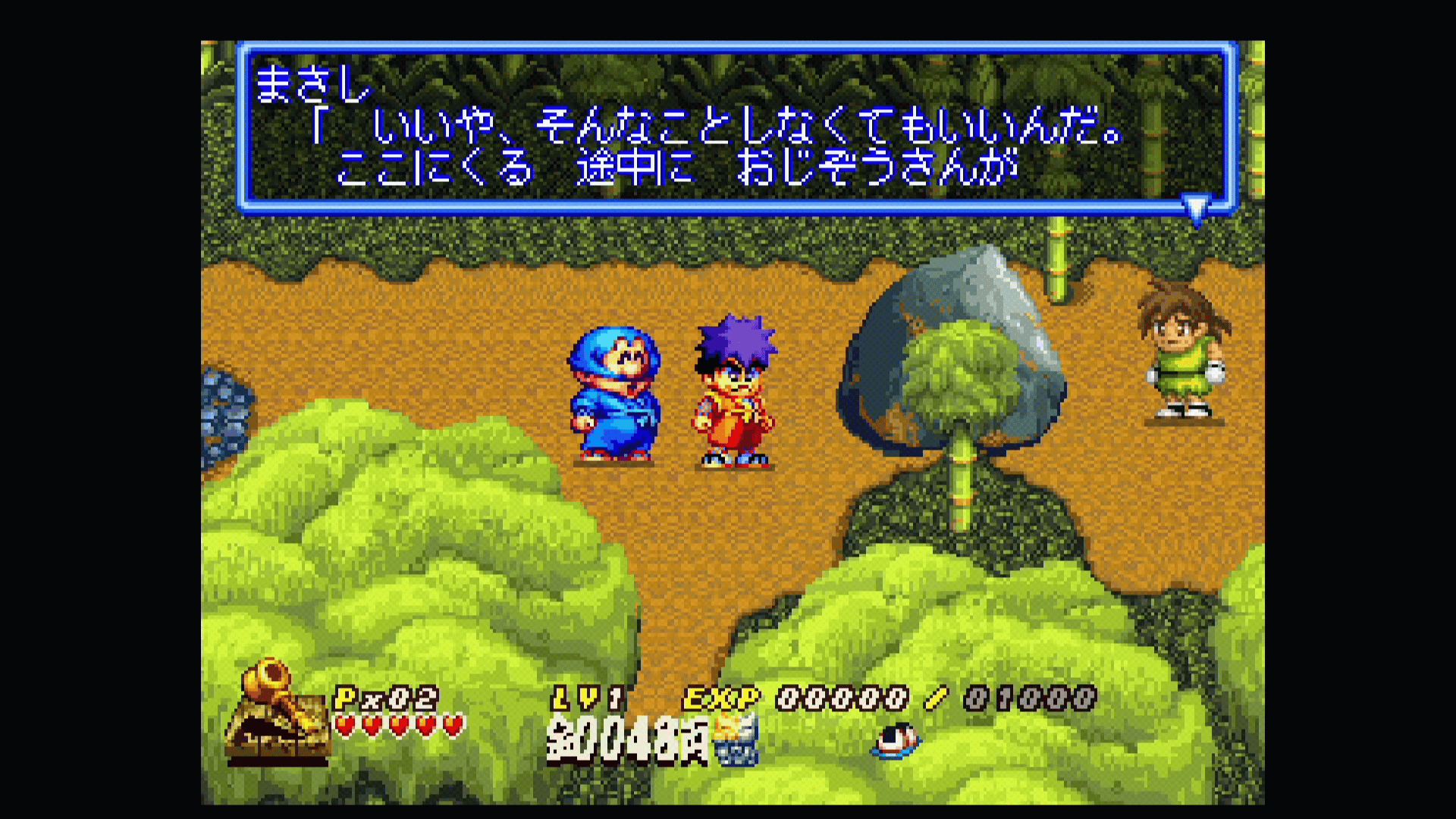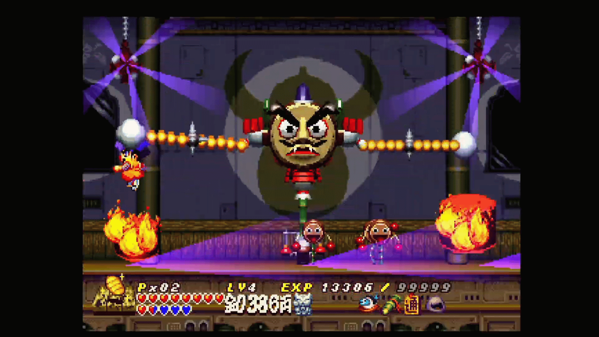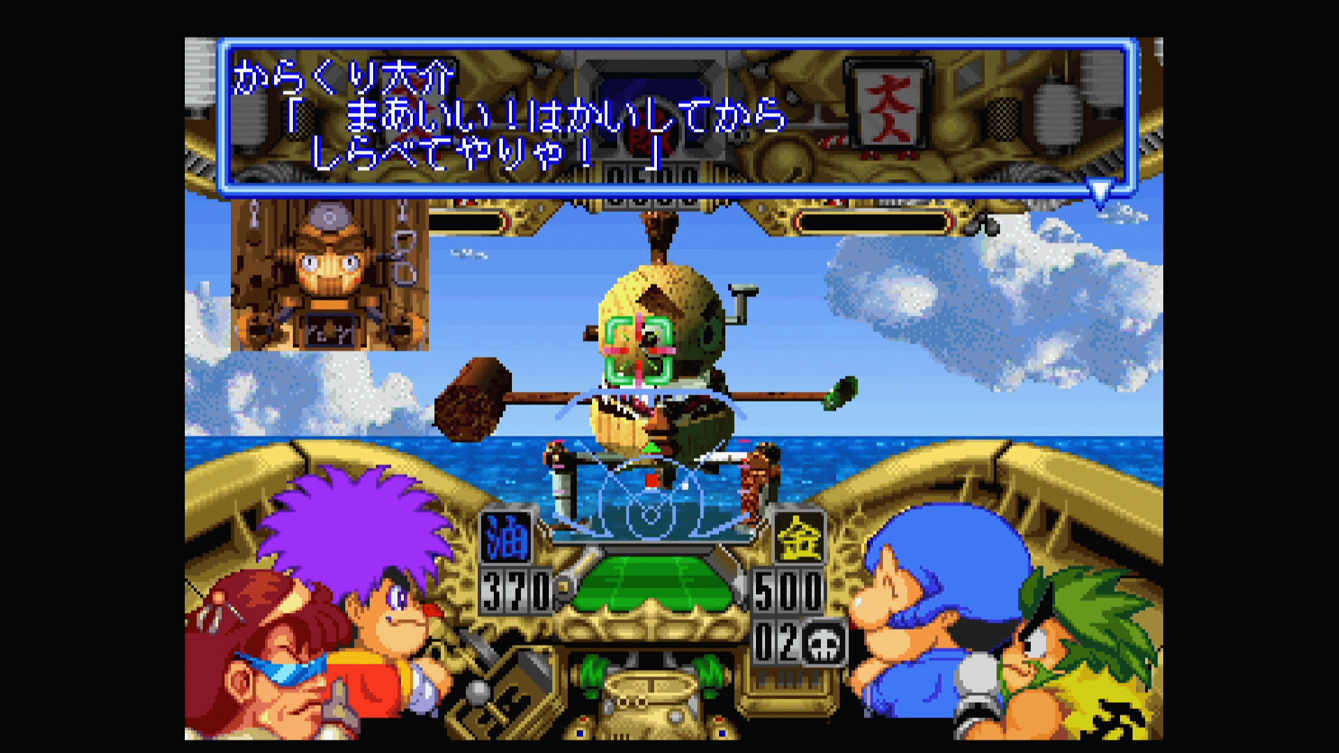Ganbare Goemon: Uchuu Kaizoku Akogingu is a Ganbare Goemon game released for the PlayStation on March 22, 1996. This is the first Goemon game since Sasuke and Yae's appearance as playable characters that doesn't include either on the playable roster. Instead, they are replaced by the new characters Goroku and Baban. Although Sasuke and Yae are playable characters again in most future games and Goroku and Baban are never seen, mentioned or heard from again after this game. Its unknown why they never appear again, but it is assumed that many fans were upset over Sasuke and Yae being replaced. Gameplay is rather similar to Ganbare Goemon 3, as there's a main map in top-down perspective, which leads to various 2-D sidescrolling levels.