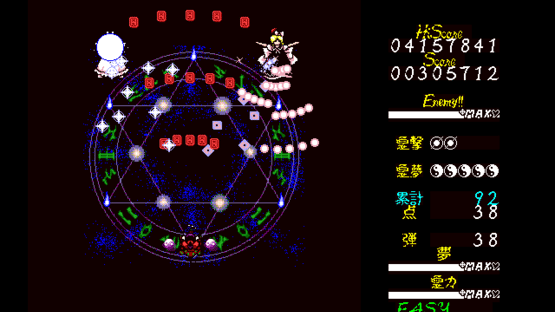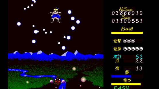 Mystic Square allows the player to select from among four unique protagonists, each hailing from one of the 2 prior danmaku shooting games in the series. Series mainstays Reimu Hakurei and Marisa Kirisame are joined by former enemies Mima and Yuuka Kazami for a journey reaching to the depths of the Makai. Mystic Square also marks the first appearance of Alice Margatroid as an opponent, who later stages a comeback in Perfect Cherry Blossom. Although limited by the PC-98 hardware, Mystic Square is the most refined of the PC-98 Touhou titles, and features gameplay quite similar to Windows Touhou games. It employs a variant of Lotus Land Story's Dream Bonus system, rewarding the player for taking risks (i.e. collecting point items from the top of the field area). Its rank system, however, is more lenient than Lotus Land Story's.