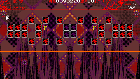 The game introduces the Shrine Maiden Reimu Hakurei, who frantically attempts to persuade a bouncing Yin-Yang Orb to hit various on-screen targets, "cards" and "bosses" alike. Reimu can knock and maneuver the Yin-Yang orb around by whacking it with her gohei, slide-tackling it, and firing shots at it. Enemies will be trying to hinder your progress by firing at you, but you can cancel out their shots with your own, or even deflect them by swinging your gohei. Only the Yin-Yang orb can damage the enemies, however, so simply firing your shots at enemies will have no effect. As a last resort, Reimu can use a "bomb", once per life, to hit all cards on the screen. There is no guarantee that any given card will be hit, and will often fail to damage a boss. The game consists of several stages of increasing difficulty, with a boss fight occurring every five stages. To complete a stage, the player should clear all cards or defeat the boss. Reimu will lose a life whenever she is hit by an enemy projectile or the yin-yang orb. There are two selectable paths in the game: the Hell path and the Makai path. Each route features unique stages, bosses, and endings.
