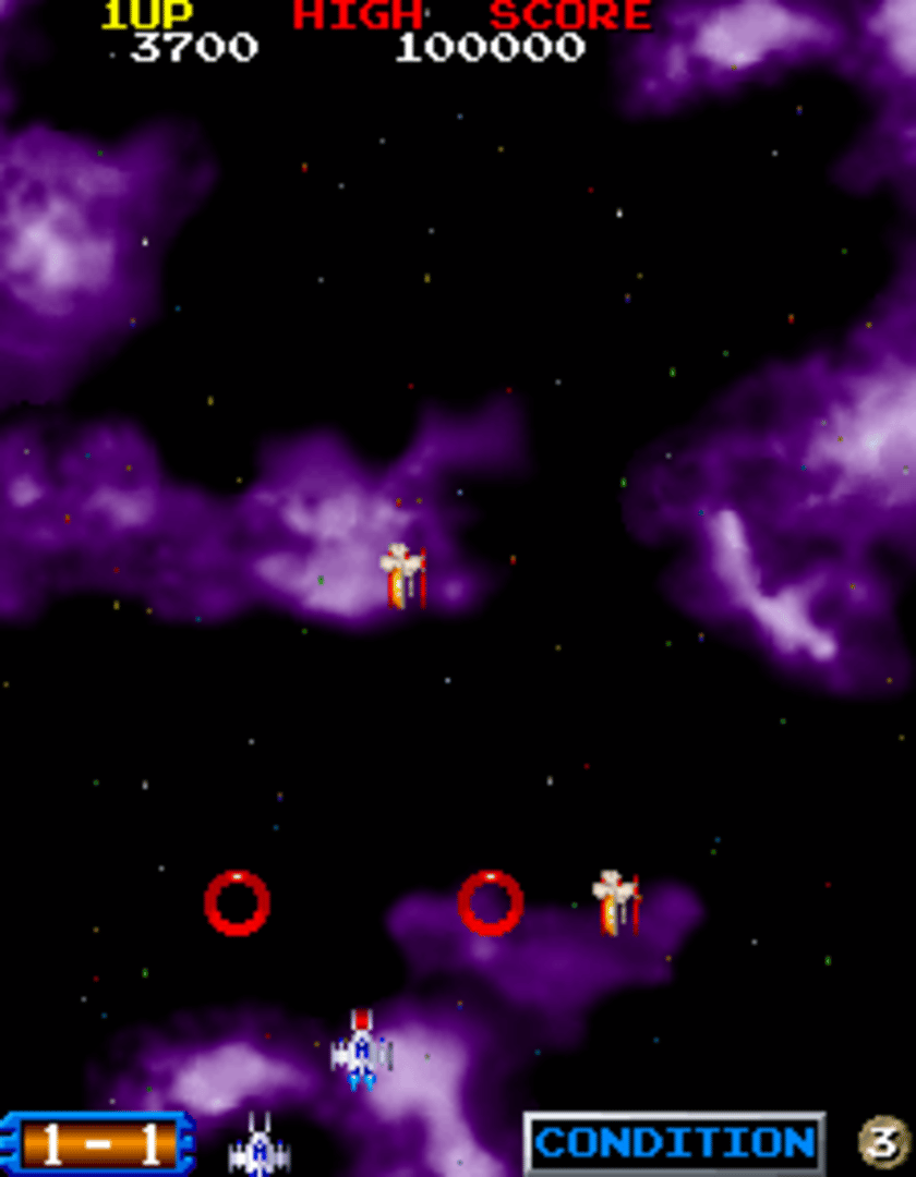 As in many other vertical scrolling shooters (including Namco's own Xevious), the player controls a ship, facing the top of the screen, that can move freely while the background scrolls down, bringing enemies in to view; the player may destroy enemies for points. The game uses two buttons - one is used to make the ship fire circular lasers, while the other is used to cycle through its four firing patterns. The red pattern is two lasers in a spiral pattern, while the blue one is one laser straight ahead and one behind, the yellow one is one laser straight ahead, one left, and one right and the green one is two lasers diagonally forward (one to the left and one to the right), and one straight behind; by holding down the button, the ship fires more powerful, spherical lasers. Even though the game is the sequel to Bosconian (which used a synthesized, DAC-generated voice saying "Blast off!" at the beginning of every round), Blast Off had more in common gameplay-wise with Namco's own Dragon Spirit than with Bosconian; this is especially noticeable in the third area of every world, where the player's ship undergoes an increase in size, and must destroy a boss. Despite several gameplay differences, the connection with Bosconian was emphasized in the marketing of the game, with the hexagonal space stations from Bosconian appearing in Namco's press literature, and on the game's title screen, and also making appearances in the game itself - and the game is also worth noting for its usages of various Engrish phrases, such as "To push start only 1 player button" (on title screen), "Go next" (at end of world), "Congraturations" (at end of game) and "Entry your name" (on high score table). There are a total of six worlds in this game, and each one has three areas (so there are a total of eighteen "stages" to play through).