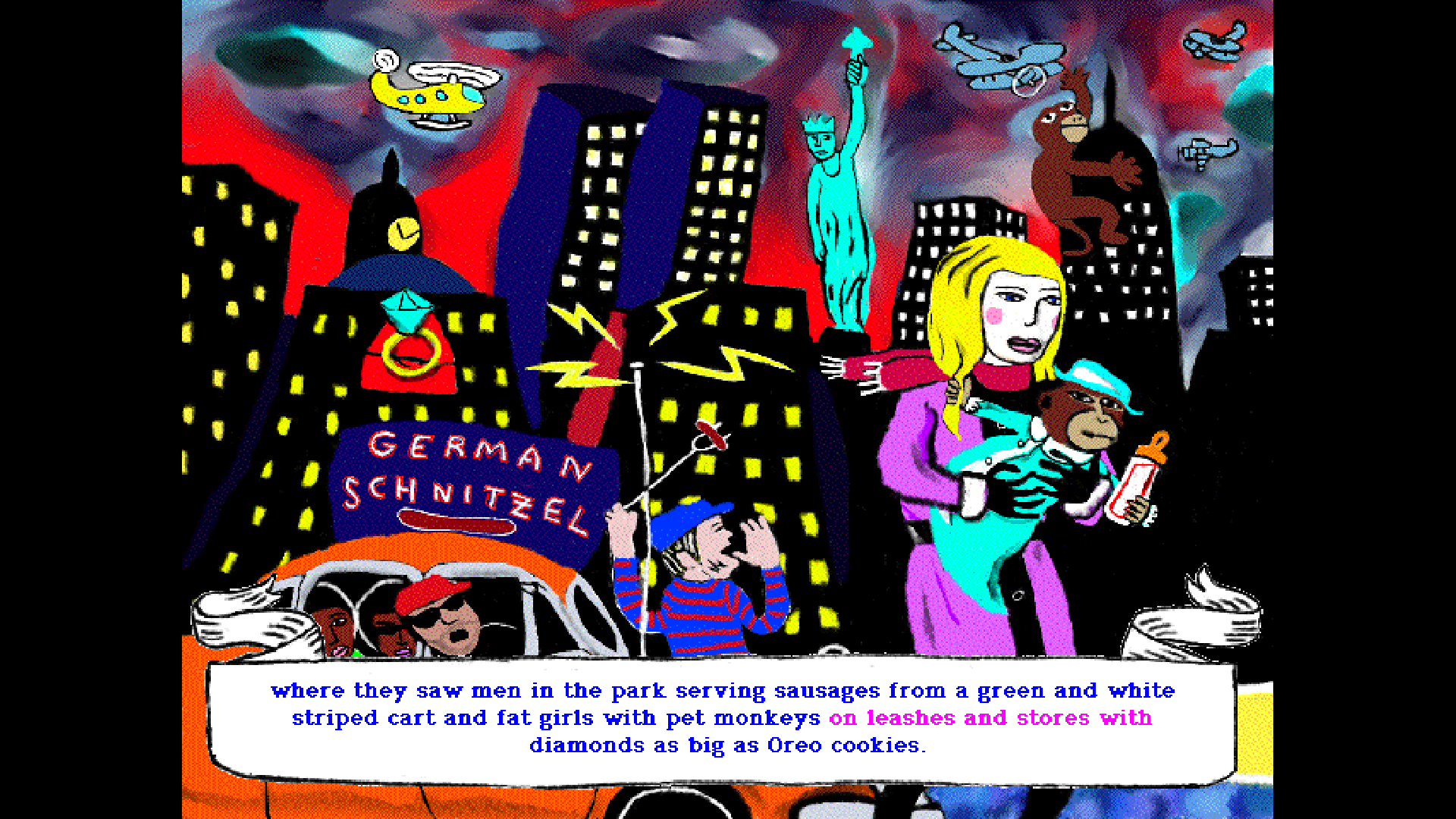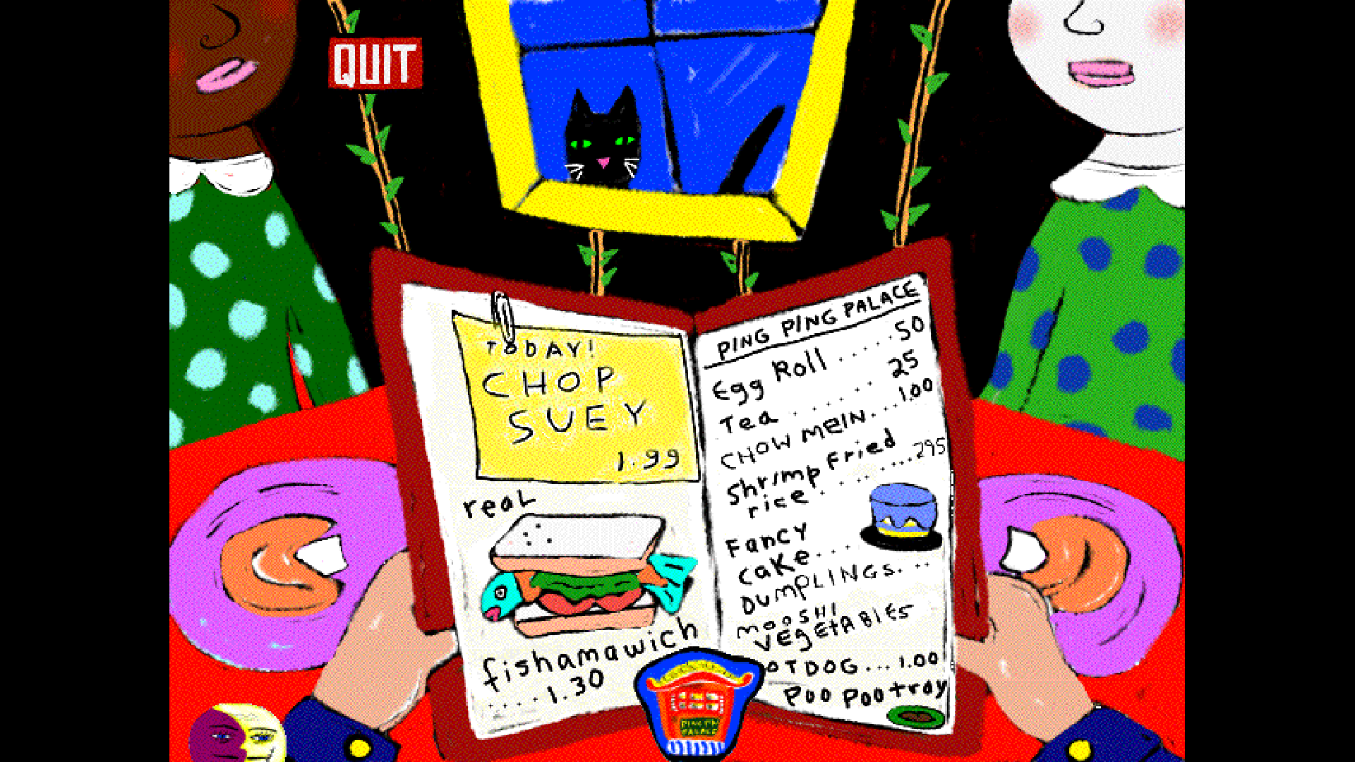 Chop Suey is a point-and-click adventure game intended for girls aged 7–12, featuring a colorful interactive storybook. The player clicks on the map of the town to explore buildings, houses and roads. Whenever everything in an area has been examined, the cursor changes to a moon, and a pointing finger appears on the screen to lead to another location.