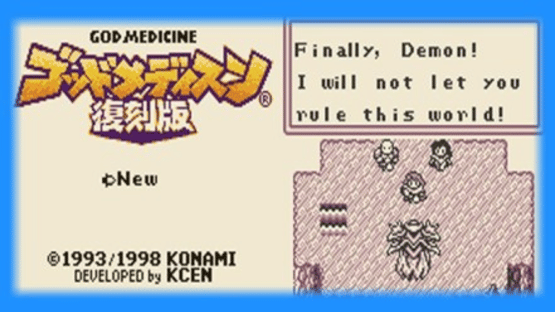 God Medicine: Fantasy Sekai no Tanjou is a role-playing video game for the Game Boy. The game was released by Konami in 1993, only in Japan. The game was re-released in 1998 through the Nintendo Power service, adding Super Game Boy support and featuring a bestiary for encountered monsters; this version was called God Medicine Hukkokuban. A video gaming company was to release Phantom, their new RPG, but the company mysteriously is destroyed. Noah, Ken, and Miki are three RPG fans that are disappointed by this. Wandering about, they stumble upon a shack with a great demon inside, battling three warriors. The warriors are defeated and the demon exits through a portal. The warriors give their souls and powers to the three RPG fans, who now must enter Phantom to save the game's world. However, they must also protect the real world from the demon. God Medicine features standard RPG elements. The three characters can level up through battle and equip weapons and armor. Spells can be learned, as well as Maphu attacks. After the party collects Maphu gems and gains the special Maphu weapons, they can put the gems in the weapons. Each gem has a different effect depending on what character equips it. Some Maphu attacks need to be charged during battle first. The charges last even if the battle is finished. The player can save anytime, except in battle.
