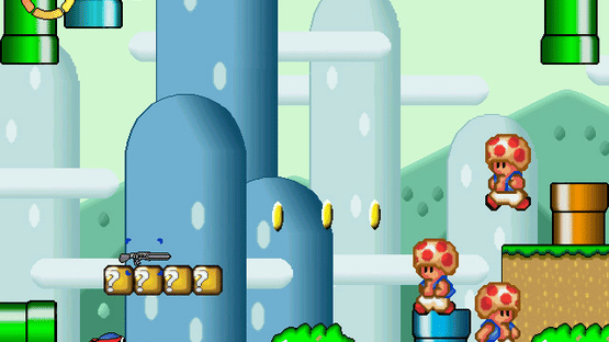 Pac-Man is a ball with a mouth; Blip and Blop are balls with arms -- conventional arms of several varieties, in addition to more exotic heavy weaponry such as lasers and flamethrowers. Chekhov's law dictates that the gun in the first act must go off in the third, but these hardened spheres haven't got the patience for that, wading directly into a non-stop carnival of carnage, a shooting frenzy only occasionally interrupted with cut-scene dialogue and nods to what might otherwise be described as the run'n'jump platformer genre -- had they legs to run and jump with.