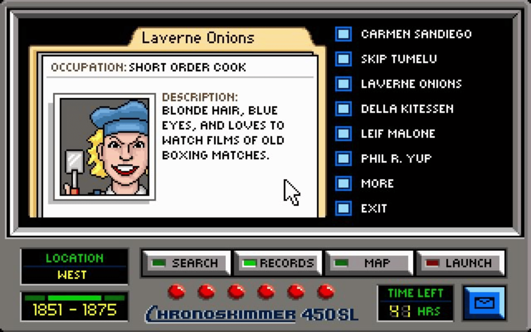 This game is widely considered the most informational game of the entire series. Though it may contain some minute differences from the main series, it remains true to it. This game's aim (as the others' are), is to capture Carmen's gang of thieves, one by one until all of her henchmen have been caught. This is done by searching for clues, trailing them, identifying them and finally, bringing them in for trial. After all of the henchmen have been caught, the player must then go after Carmen herself. One of the main differences is that the player can receive in-game help.