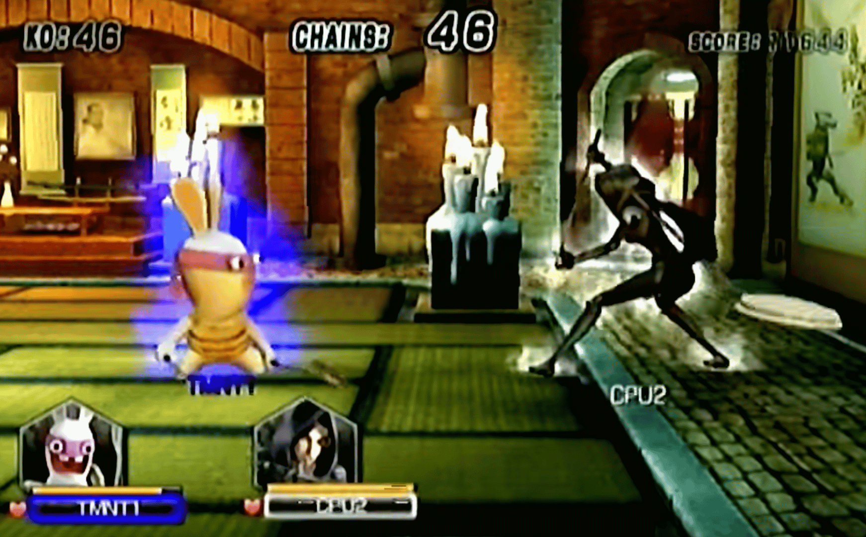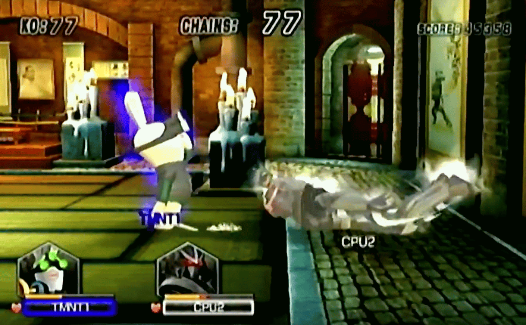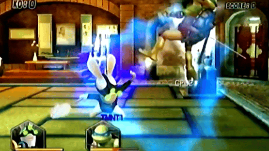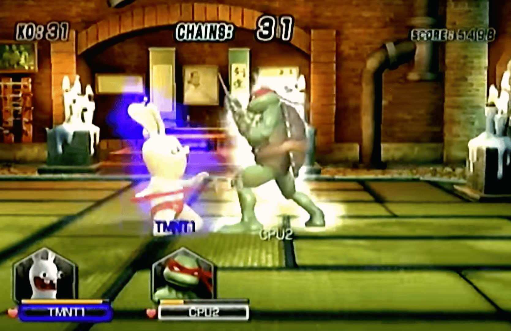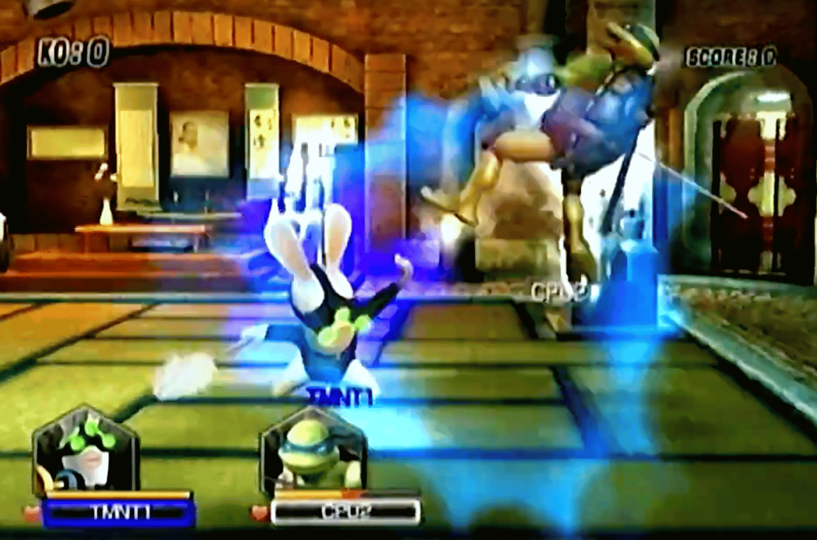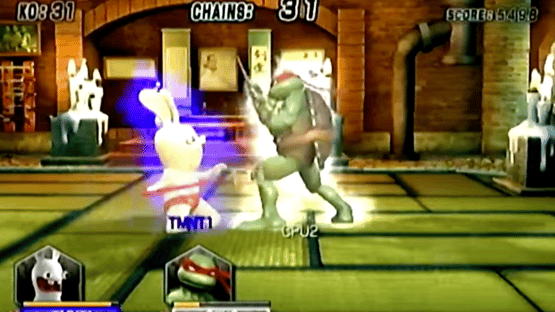 Teenage Mutant Ninja Turtles: Smash-Up is a fighting video game for the Wii and PlayStation 2 video game consoles. It was developed by Game Arts in cooperation with Mirage Studios and released by Ubisoft in celebration of the 25th anniversary of the Teenage Mutant Ninja Turtles in 2009. The game is a 4-player 2.5D fighting game, similar to the Super Smash Bros. series. During battle, players attempt to KO opponents by depleting their life bar, knocking them off the stage or into traps.Characters are color-coded on-screen via a glow effect to help players keep track of their character (a feature that can be toggled on and off in the options screen). Like Super Smash Bros., the game features many customizable options for battles.The game stresses interaction with the environment, and stages in the game feature traps, changes to the stage itself and interactive elements. The gameplay system also features items, including life-restoring pizza and ninja skills that grant players special abilities like fire breathing and electrical shields. The modes for this game are Arcade, Battle Royal, Survival, Tournament, Swap-Out, Practice, and Mission Mode, as well as an online mode for four players and mini-games. Players can collect 'shells' during battles or mini-games and use them to unlock special features, including trophies that other players can win in online tournaments. Arcade mode features animated cut scenes illustrated by Mirage Studios artists.