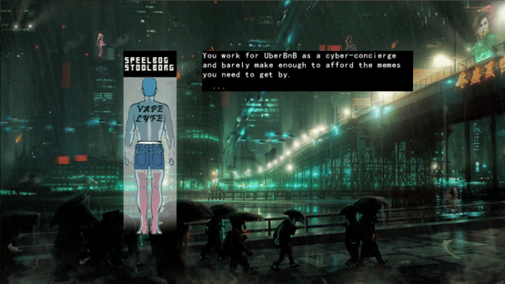 The year is 2017. Late-term capitalism has made everything very bad. You live in the gritty cyberpunk city of Neo Detroit, making just enough to afford the memes you need to get by. Vaping is illegal. To make matters worse, you've defaulted on your student loans and your credit agency has reassigned your name to be worst_name SPEELBOG STOOLBORG. But everyone has to have a little fun once in a while! Take a trip to the party spa for a night of R&R. Bribe the bouncer with a meme. Buy illegal vape juice. Browse the sauna and talk to the patrons. Who knows, you might just find love (spoiler: you will).