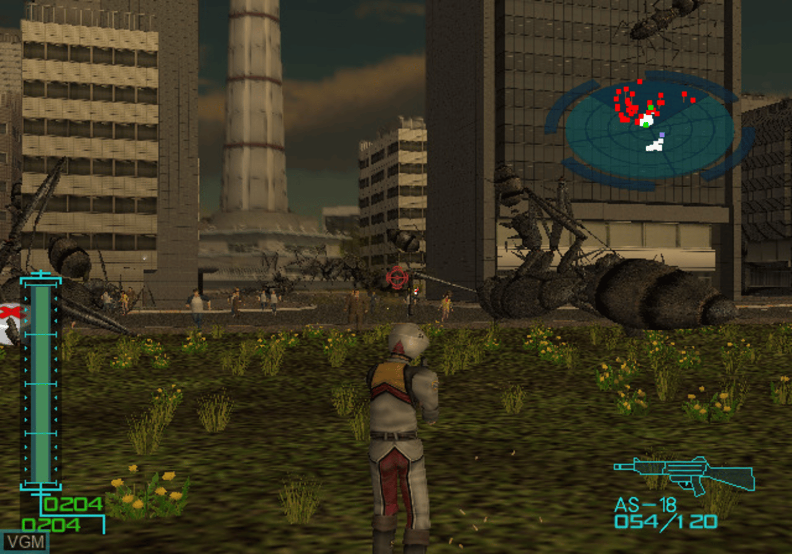 Monster Attack is a third-person action shooter and the first game in the Chikyuu Boueigun / Earth Defense Force series. The player takes the role of an EDF (Earth Defence Force) infantry man to single handily battle hordes of giant bugs, robots and alien ships that have invaded Earth, across 30 missions. The game eludes to other EDF forces, but they are never seen. You choose two weapons for each mission from dozens of various missile launchers, machine guns, flamethrowers and more unique weapons, some, faster, more powerful or better suited to the mission at hand than others, are given infinite ammo (though the weapons must still be reloaded after each clip is used up) and are set loose in one of several (usually city-based) fully destructible environments. Players can also mount a vehicles such as an air bike, a tank and a helicopter. The player recovers and increases his maximum health and armour, and unlocks new weapons by picking up power-ups from defeated enemies that spawn in and come at the player by the dozen. The game also features 2-player split-screen cooperative multiplayer.