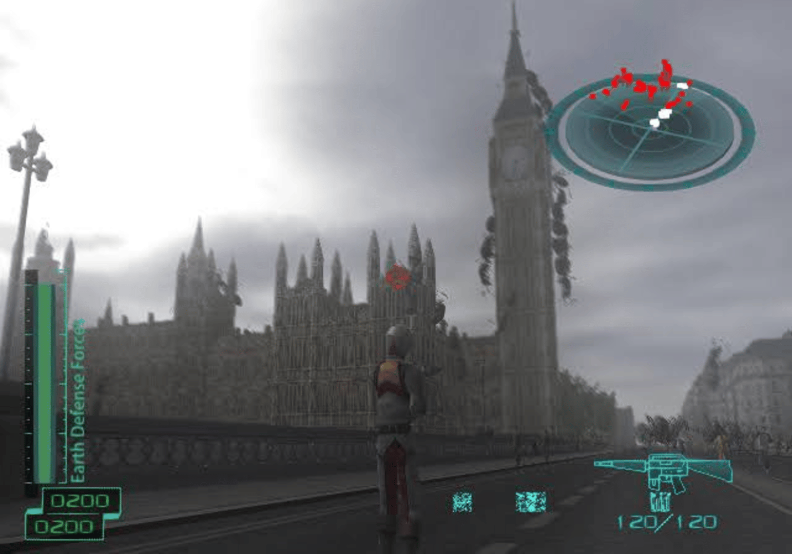 The second game in the The Chikyuu Boueigun series, renamed Global Defence Force for its English release (similarly the first game was renamed Monster Attack for its English release). It's been two years since the invading alien menace was defeated by the Global Defence Force (the game renames the "Earth Defence Force" from the previous game), but like any good off-world threat, they're back for more, and they've brought new weapons and technology in their attempts to take Earth and eliminate humanity. Thankfully, the GDF has also been developing new technology to fight them. Global Defence Force is a third-person action shooter. Choose from either an GDF infantryman or the flight-capable Pale Wing, each with different abilities and dozens of weapons each, and set out to shoot down hordes of giant insects, enormous robots, and UFOs of incredible scale. You can choose two weapons to carry for each mission, and pickups dropped by enemies will unlock new weapons and increase your character's maximum health. You can play the game split-screen cooperatively. Beyond adding a second player class to choose from; the Pale Wing; a fragile but powerful melee centric character with a limited Jetpack and her own weapon set, to go alongside the infantry man of the first game, Global Defence Force doesn't change much of the basic game play of Monster Attack. But leaving at that would undersell the game; there are numerous new alien types, weapons and environments that add much more variety to things. The maps are larger and more detailed and missions are longer and much more scripted (where as the original game nearly always threw you into an environment against some preplaced bug's, this time you often have some simple objective(s)) to add further variety. Finally the physics have been notably enhanced. Like Monster Attack, the player in Global Defence Force fights completely by themselves despite being part of an army (unless playing offline only 2 player split screen); the original Japanese version features radio chatter from other GDF squads and your commanding officer, to give the illusion that you are fighting alongside others. This was cut from the English release.
