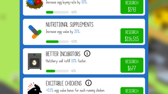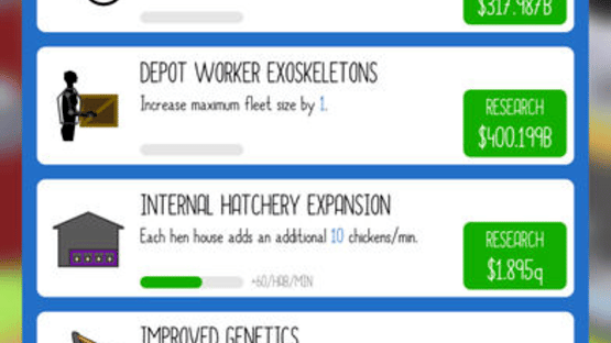 Egg, Inc. is a mobile idle simulation game where players build and manage a futuristic egg farm. The goal is to hatch chickens, expand housing, upgrade vehicles, and research technologies to maximize egg production. As players progress, they unlock increasingly valuable egg types tied to scientific and economic breakthroughs. The game combines incremental mechanics with light management strategy, featuring contracts, missions, and prestige resets that encourage long‑term progression.