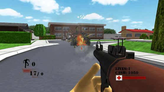 Zombie Defense Squad is a first-person shooter in which the player has to defend a small town from zombie waves. To win a round, a certain amount of zombies have to eradicated from the map. Each killed zombie is rewarded with experience points (which leads to level-ups and automatically assigned bonuses like faster reloads or higher walking speed) and money. The latter is used between rounds to buy better weapons and ammo in the store. Each round adds zombies to the wave.