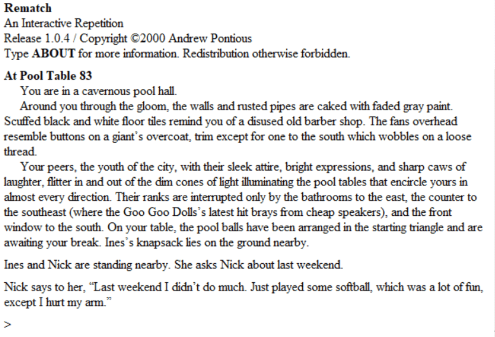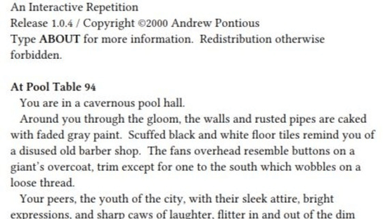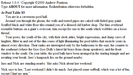 Like Aisle, this is a game that only lasts one move; you're expected to repeat that move many, many times. Unlike Aisle, though, this is a puzzle game--there's a problem you're trying to solve in that one move. It's a pretty complex problem, moreover, and the parser is accordingly expanded--in some syntaxes, up to five nouns, well beyond the norm. Not only is the puzzle difficult, but there are some red herrings that make the puzzle even harder--but it's also very satisfying when you finally do solve it. Both funny and grim--lots of amusing stuff around the edges, but the puzzle itself isn't particularly funny. A few nudges are included in the game, but no explicit spoilers. Interactive Fiction written by Andrew D. Pontious.