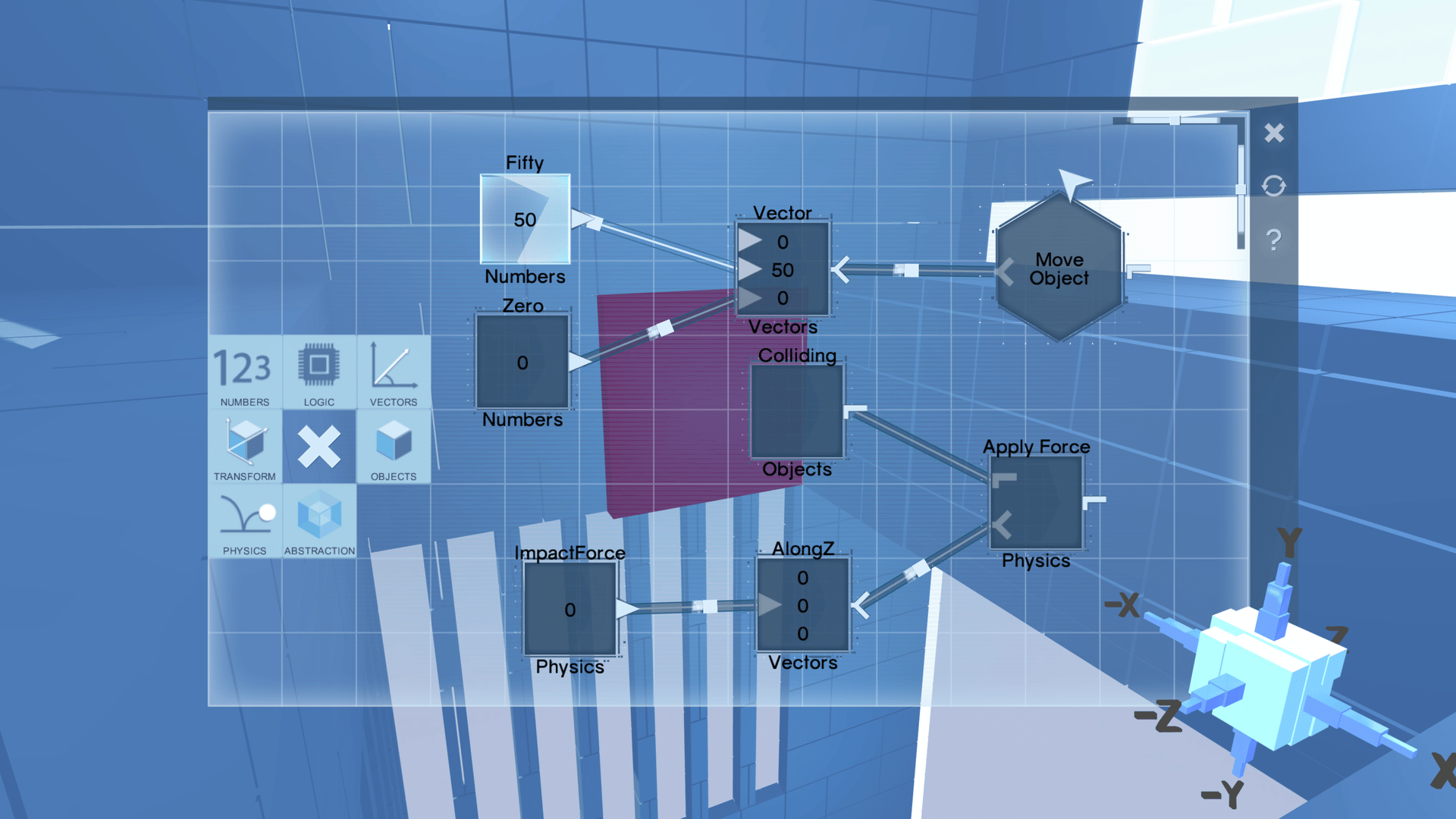 Glitchspace is about reprogramming the game to solve puzzles. Trapped in an abstract cyberspace world, your way forward uses visual programming to edit environmental geometry, whilst unlocking key programming concepts along the way. Stretch, scale, rotate, manipulate and create, explore a world of reprogrammable geometry as you discover your way home, ever distant on the horizon.