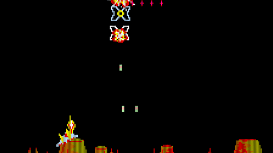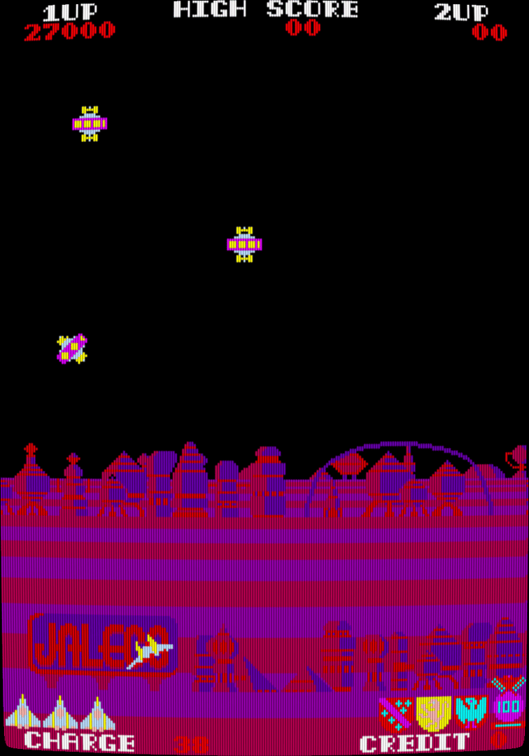 Exerion is a vertical shoot 'em up released by Jaleco in 1983 and licensed to Taito for distribution in the United States. Screenshot from arcade version Exerion is a shoot 'em up game featuring parallax effects and inertia simulation, something notable for 1983. The player travels around strange scenarios shooting aliens. The player has two types of guns: fast single shot (limited) or slow double shot (unlimited). In 1984, along with the MSX1 port of the original, a sequel was released titled Exerion II: Zorni for the MSX1, with similar gameplay to the original. There were plans for an NES release of this game. In 1987, the game was followed by the semi-sequel titled Exerizer, also known as Sky Fox.